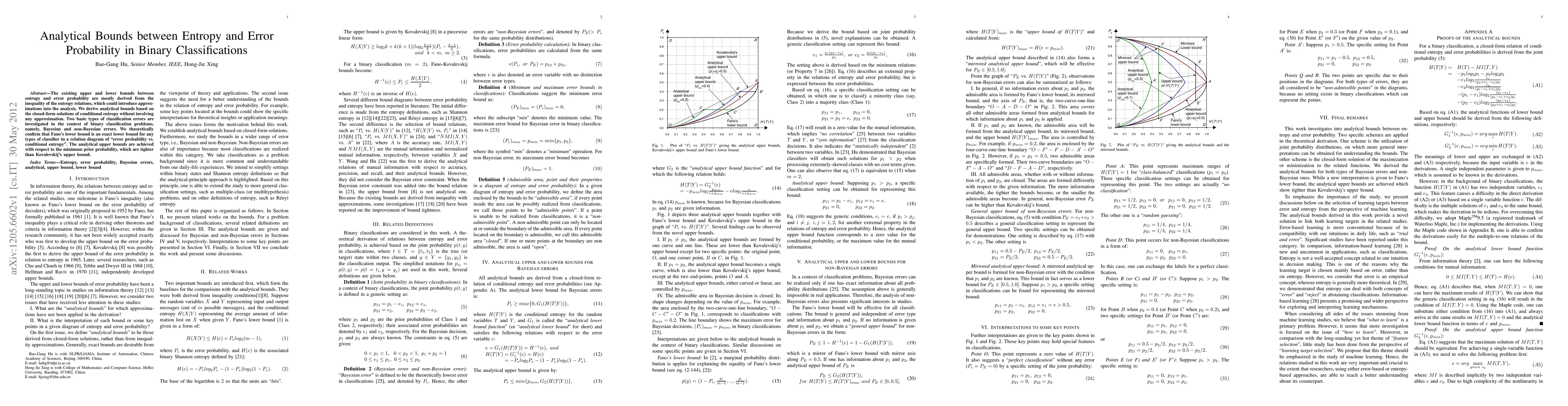 The existing upper and lower bounds between entropy and error probability are mostly derived from the inequality of the entropy relations, which could introduce approximations into the analysis. We derive analytical bounds based on the closed-form solutions of conditional entropy without involving any approximation. Two basic types of classification errors are investigated in the context of binary classification problems, namely, Bayesian and non-Bayesian errors. We theoretically confirm that Fano's lower bound is an exact lower bound for any types of classifier in a relation diagram of "error probability vs. conditional entropy". The analytical upper bounds are achieved with respect to the minimum prior probability, which are tighter than Kovalevskij's upper bound.
