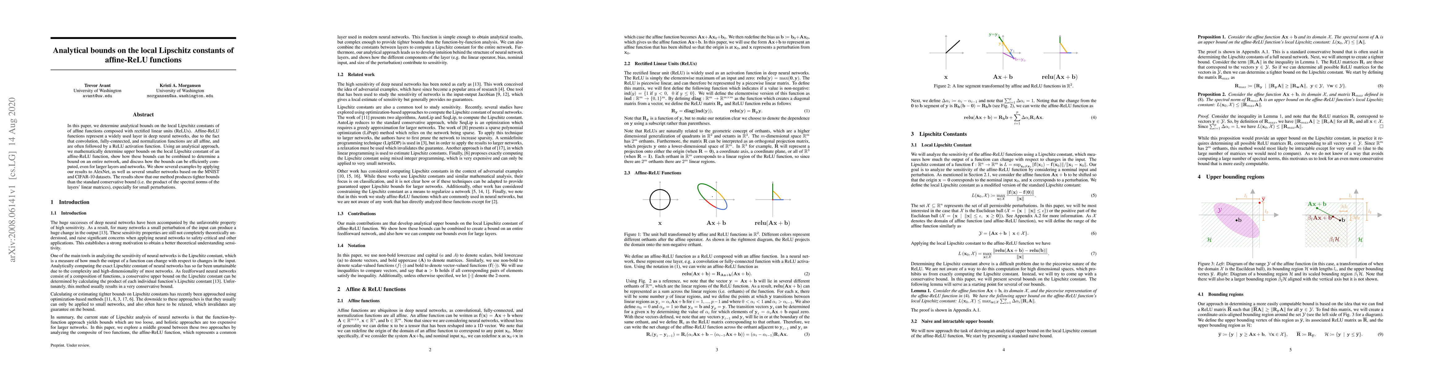 This paper analytically determines upper bounds on the local Lipschitz constants of affine-ReLU functions, which are common in deep neural networks. The authors show that their method produces tighter bounds than standard conservative methods, especially for small perturbations.