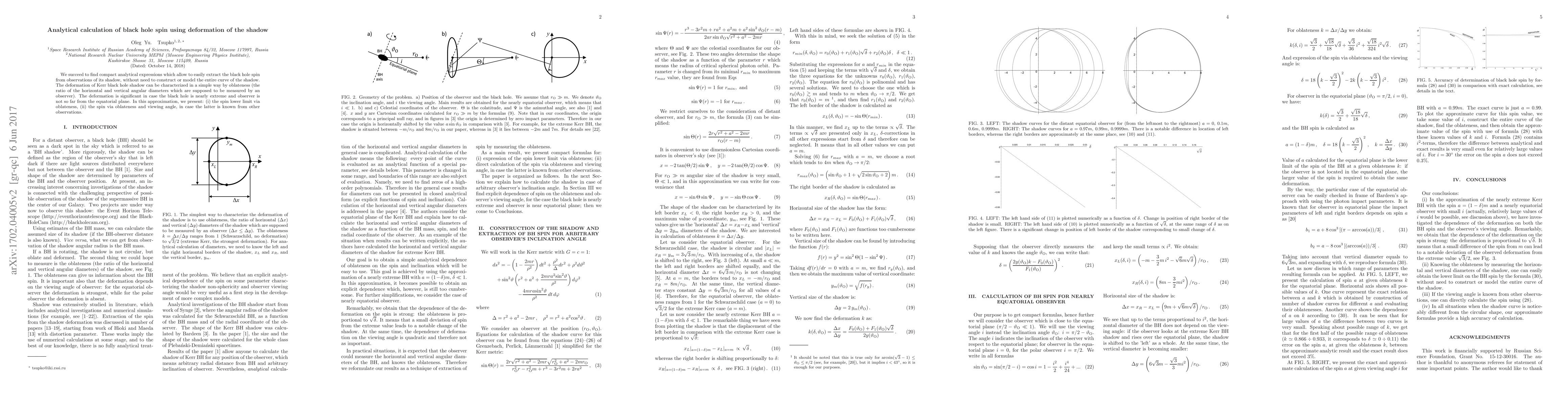 We succeed to find compact analytical expressions which allow to easily extract the black hole spin from observations of its shadow, without need to construct or model the entire curve of the shadow. The deformation of Kerr black hole shadow can be characterised in a simple way by oblateness (the ratio of the horizontal and vertical angular diameters which are supposed to be measured by an observer). The deformation is significant in case the black hole is nearly extreme and observer is not so far from the equatorial plane. In this approximation, we present: (i) the spin lower limit via oblateness, (ii) the spin via oblateness and viewing angle, in case the latter is known from other observations.