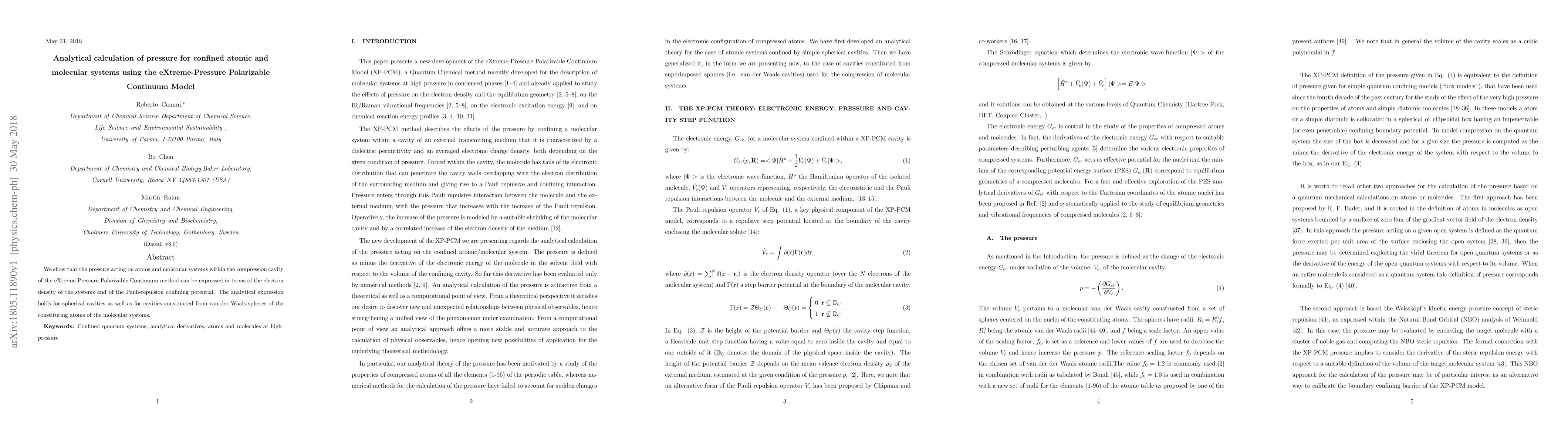 We show that the pressure acting on atoms and molecular systems within the compression cavity of the eXtreme-Pressure Polarizable Continuum method can be expressed in terms of the electron density of the systems and of the Pauli-repulsion confining potential. The analytical expression holds for spherical cavities as well as for cavities constructed from van der Waals spheres of the constituting atoms of the molecular systems.