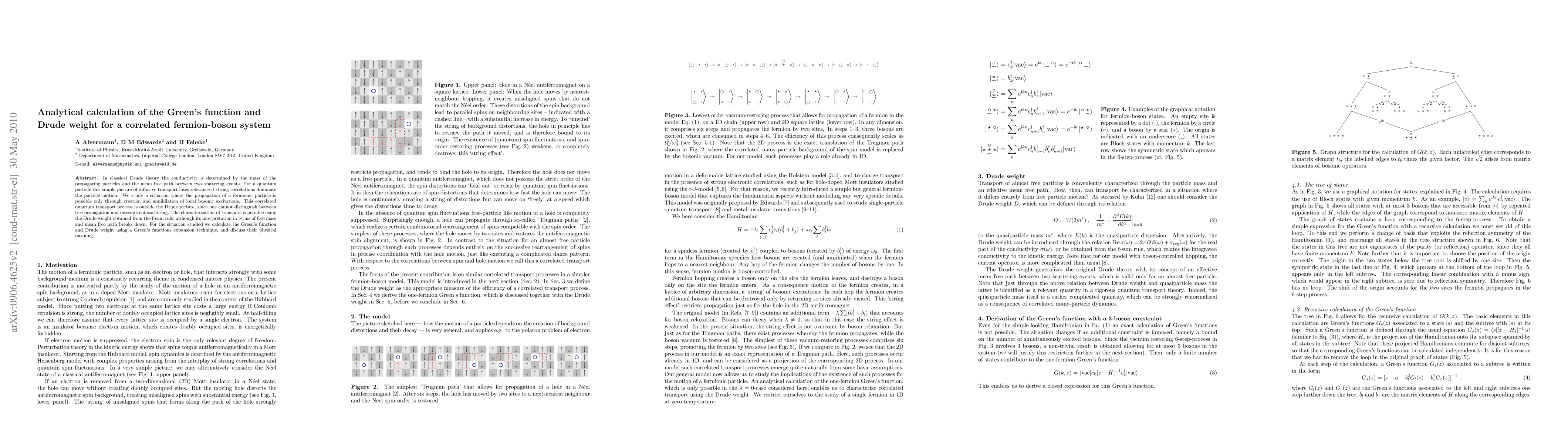 This research calculates the Green's function and Drude weight for a quantum system where fermionic particles move via local bosonic excitations, a process not fitting classical Drude theory. The method involves Green's functions expansion, revealing a new perspective on transport characterization in strongly correlated systems.