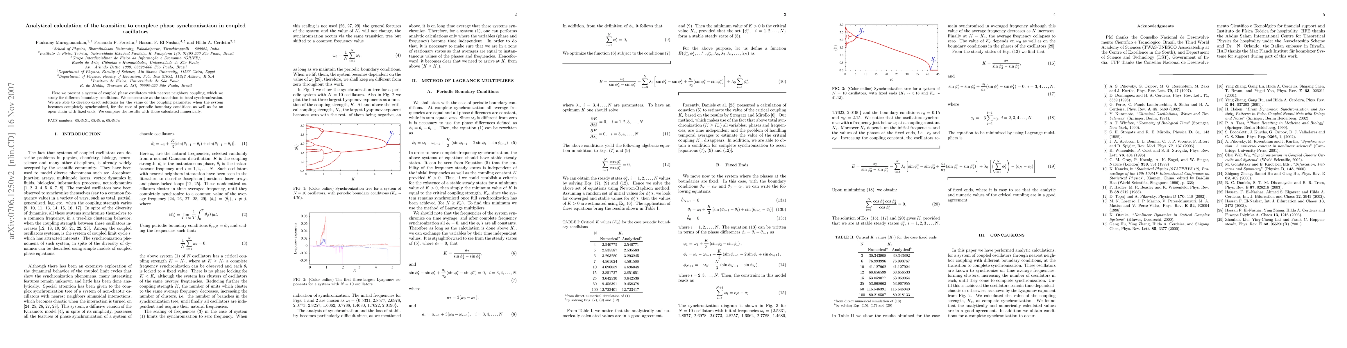 Here we present a system of coupled phase oscillators with nearest neighbors coupling, which we study for different boundary conditions. We concentrate at the transition to total synchronization. We are able to develop exact solutions for the value of the coupling parameter when the system becomes completely synchronized, for the case of periodic boundary conditions as well as for an open chain with fixed ends. We compare the results with those calculated numerically.