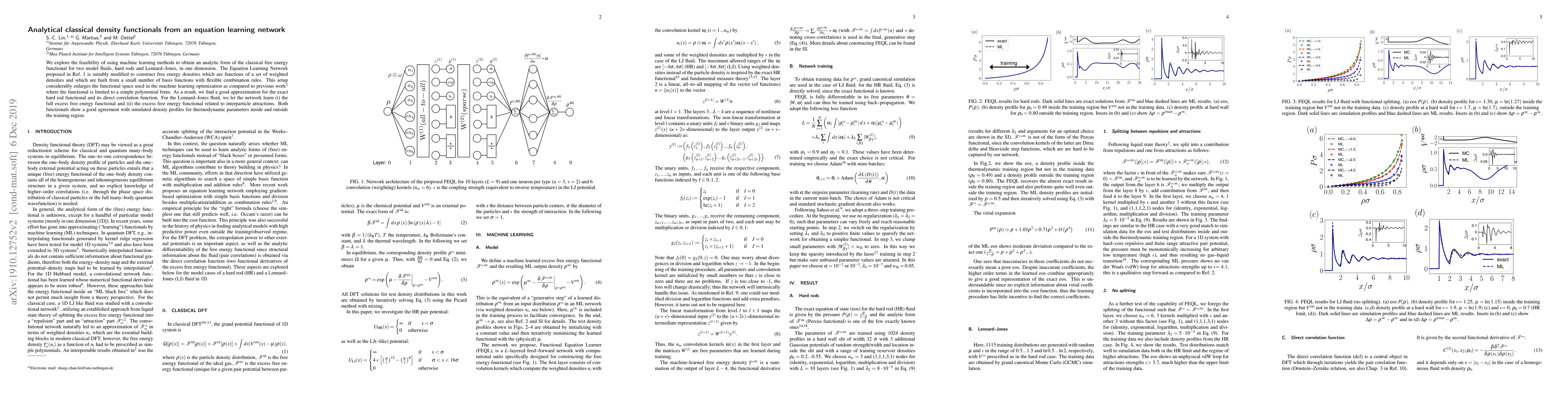 We explore the feasibility of using machine learning methods to obtain an analytic form of the classical free energy functional for two model fluids, hard rods and Lennard--Jones, in one dimension . The Equation Learning Network proposed in Ref. 1 is suitably modified to construct free energy densities which are functions of a set of weighted densities and which are built from a small number of basis functions with flexible combination rules. This setup considerably enlarges the functional space used in the machine learning optimization as compared to previous work 2 where the functional is limited to a simple polynomial form. As a result, we find a good approximation for the exact hard rod functional and its direct correlation function. For the Lennard--Jones fluid, we let the network learn (i) the full excess free energy functional and (ii) the excess free energy functional related to interparticle attractions. Both functionals show a good agreement with simulated density profiles for thermodynamic parameters inside and outside the training region.