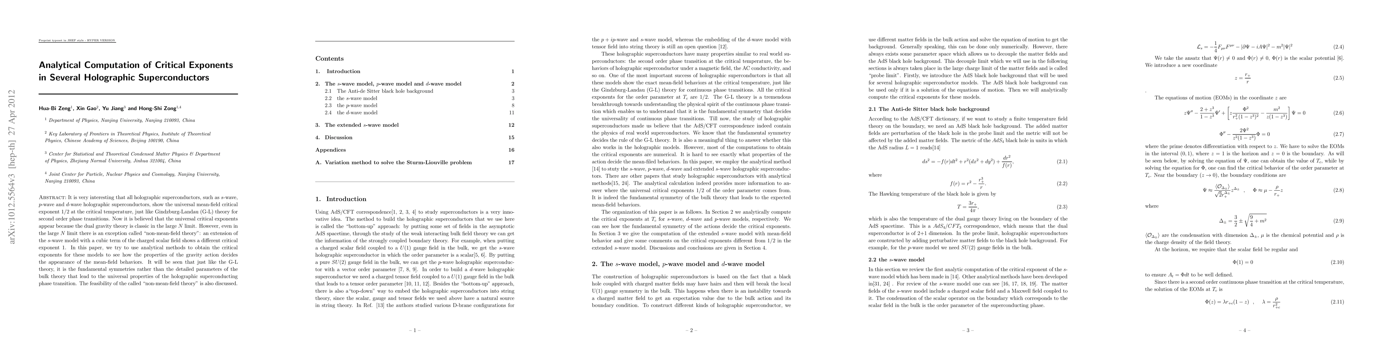 This paper analytically computes critical exponents in various holographic superconductor models, finding that most exhibit a universal mean-field exponent of 1/2, akin to G-L theory, but also explores a "non-mean-field theory" variant with a different critical exponent of 1, emphasizing the role of fundamental symmetries in determining these universal properties.