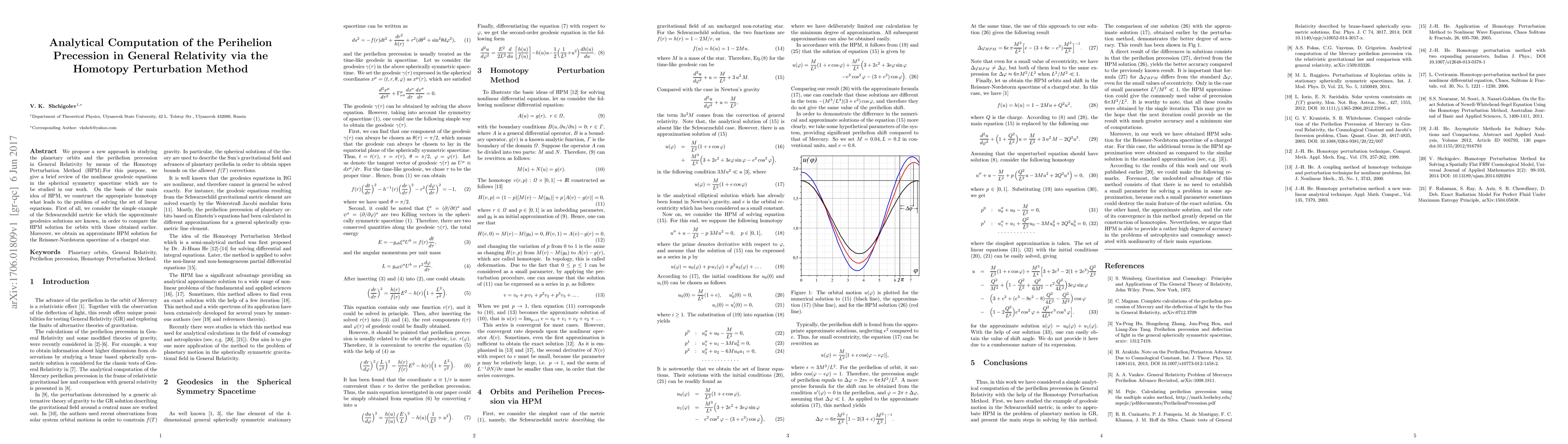 This paper introduces the Homotopy Perturbation Method (HPM) to compute the perihelion precession in General Relativity, reviewing nonlinear geodesic equations in spherical symmetry. The method is tested on the Schwarzschild metric and extended to the Reissner-Nordström spacetime for a charged star.