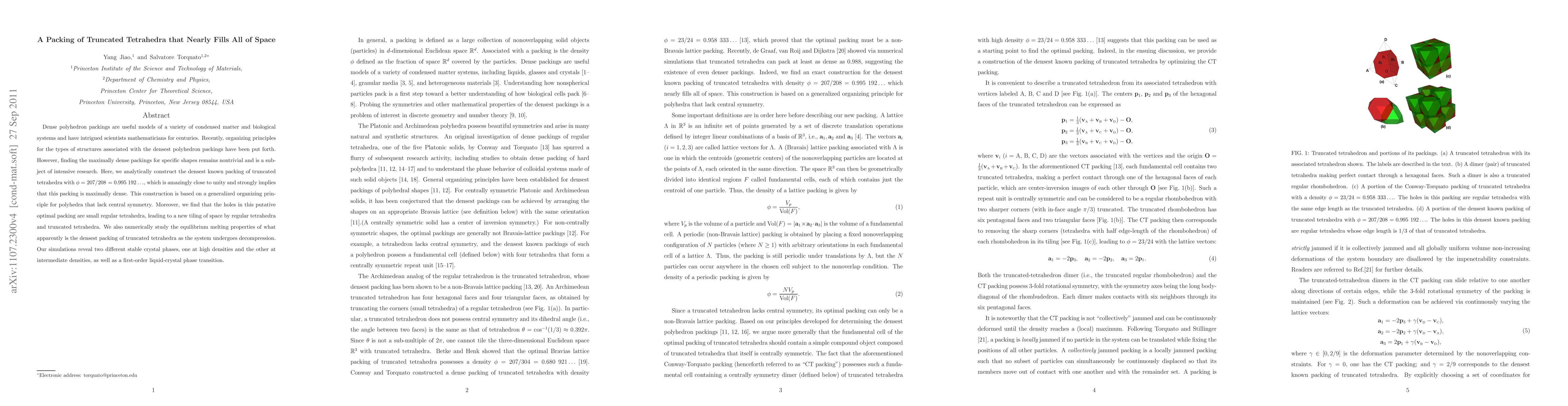 This paper analytically constructs the densest packing of truncated tetrahedra, achieving a packing density of $\phi=207/208$, and suggests it is maximally dense. The study also reveals a new space tiling by regular and truncated tetrahedra, and numerically investigates the melting properties, identifying two stable crystal phases and a liquid-crystal phase transition.