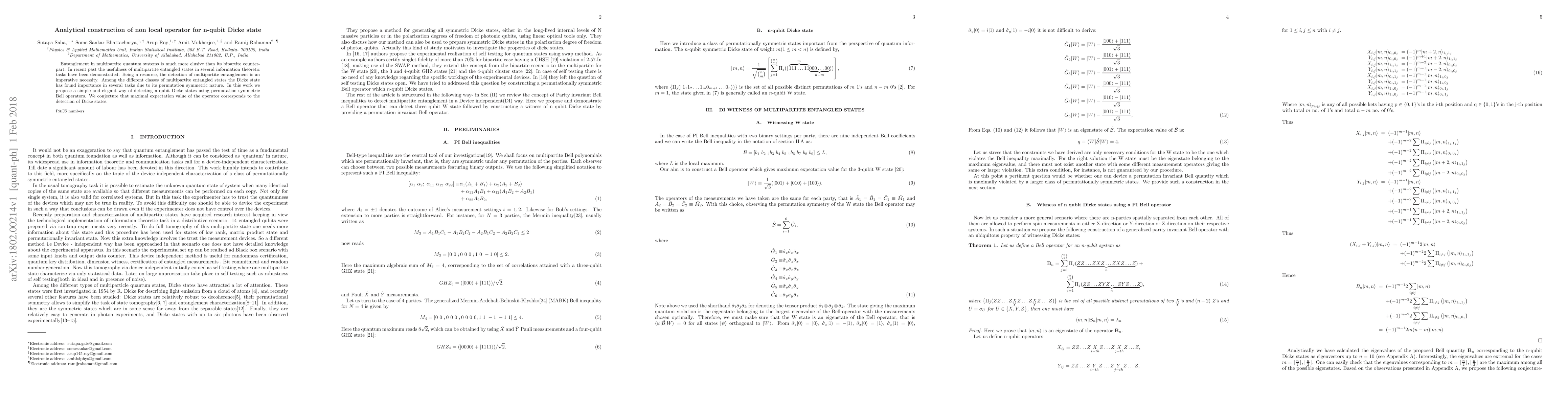 Entanglement in multipartite quantum systems is much more elusive than its bipartite counterpart. In recent past the usefulness of multipartite entangled states in several information theoretic tasks have been demonstrated. Being a resource, the detection of multipartite entanglement is an imperative necessity. Among the different classes of multipartite entangled states the Dicke state has found importance in several tasks due to its permutation symmetric nature. In this work we propose a simple and elegant way of detecting n qubit Dicke states using permutation symmetric Bell operators. We conjecture that maximal expectation value of the operator corresponds to the detection of Dicke states.