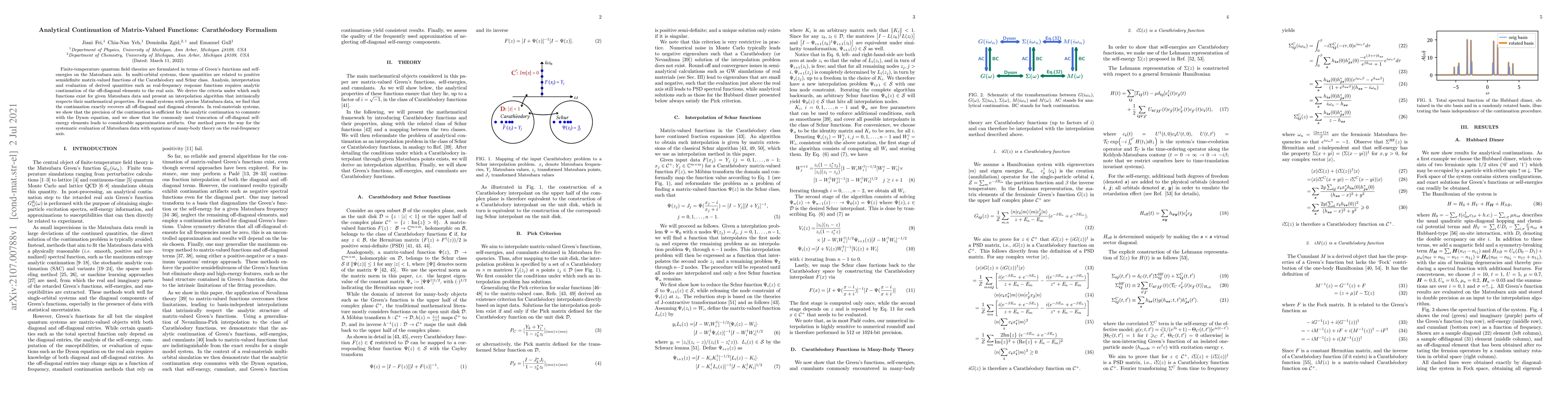 This paper develops criteria for the analytic continuation of matrix-valued functions in finite-temperature quantum field theories, focusing on the Carathéodory formalism. It provides an algorithm that respects the mathematical properties of these functions, demonstrating its effectiveness in small systems and its applicability in real-material systems despite approximation artifacts from truncation.