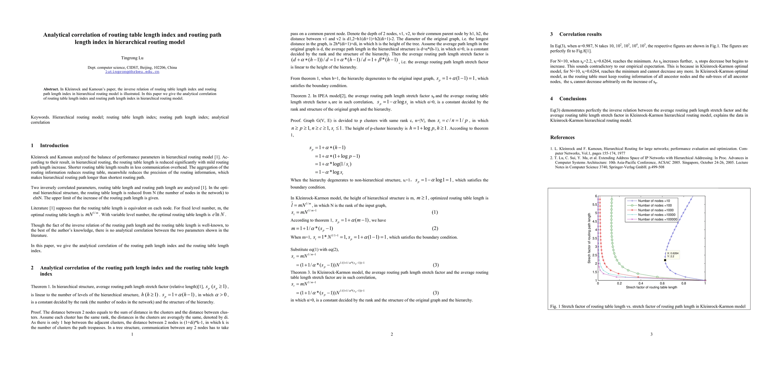 In Kleinrock and Kamoun's paper, the inverse relation of routing table length index and routing path length index in hierarchical routing model is illustrated. In this paper we give the analytical correlation of routing table length index and routing path length index in hierarchical routing model.