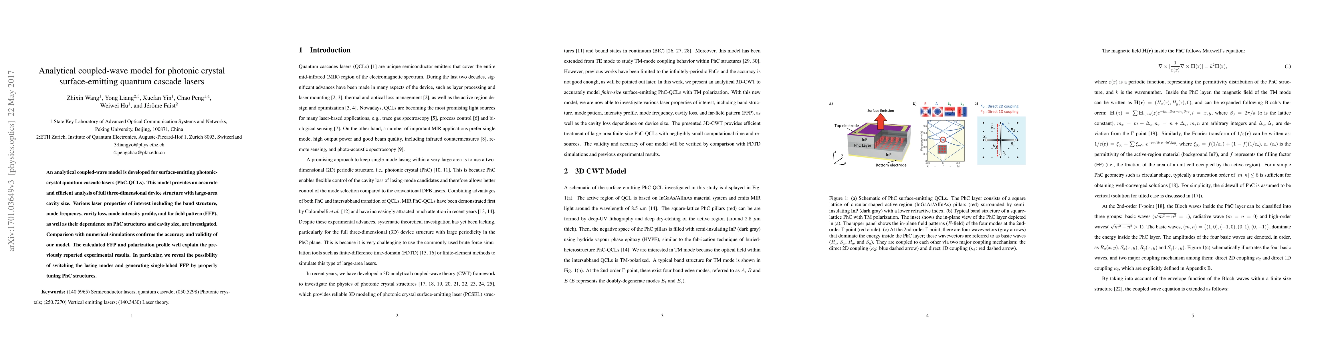 This paper presents an analytical coupled-wave model for photonic-crystal quantum cascade lasers, enabling efficient analysis of large-area three-dimensional device structures, validated through simulations and experimental results.