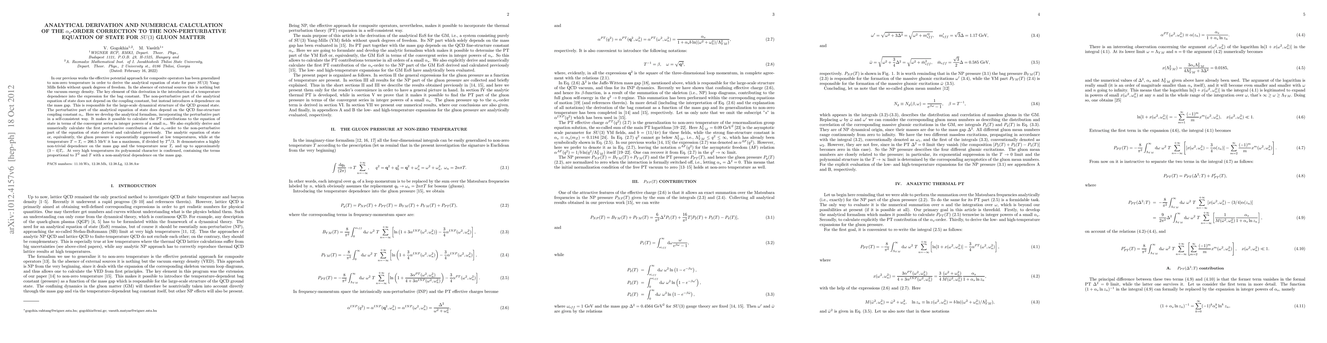 In our previous works the effective potential approach for composite operators has been generalized to non-zero temperature in order to derive the analytical equation of state for pure SU(3) Yang-Mills fields without quark degrees of freedom. In the absence of external sources this is nothing but the vacuum energy density. The key element of this derivation is the introduction of a temperature dependence into the expression for the bag constant. The non-perturbative part of the analytical equation of state does not depend on the coupling constant, but instead introduces a dependence on the mass gap. This is responsible for the large-scale dynamical structure of the QCD ground state. The perturbative part of the analytical equation of state does depend on the QCD fine-structure coupling constant $\alpha_s$. Here we develop the analytical formalism, incorporating the perturbative part in a self-consistent way. It makes it possible to calculate the PT contributions to the equation of state in terms of the convergent series in integer powers of a small $\alpha_s$. We also explicitly derive and numerically calculate the first perturbative contribution of the $\alpha_s$-order to the non-perturbative part of the equation of state derived and calculated previously. The analytical equation of state or, equivalently, the gluon pressure is exponentially suppressed at low temperatures, while at temperature $T=T_c = 266.5 \ \MeV$ it has a maximum, if divided by $T^4/3$. It demonstrates a highly non-trivial dependence on the mass gap and the temperature near to $T_c$ and up to approximately $(3-4)T_c$. At very high temperatures its polynomial character is confirmed, containing the terms proportional to $T^2$ and $T$ with a non-analytical dependence on the mass gap.