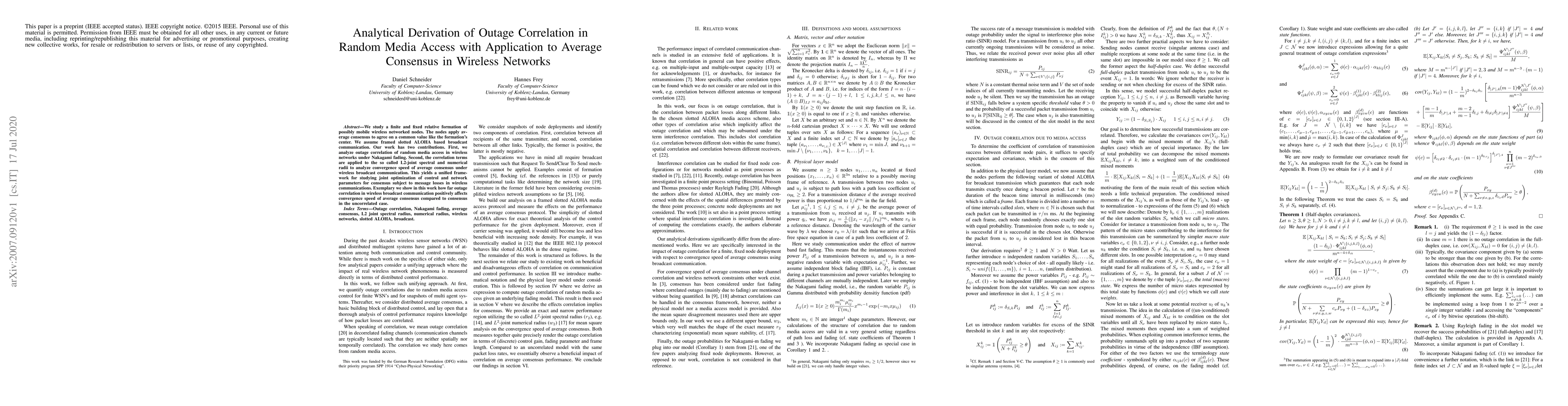 This paper analyzes the outage correlation in random media access for wireless networks under Nakagami fading, focusing on the convergence speed of average consensus. It introduces a unified framework for optimizing control and network parameters to enhance consensus performance despite message losses, demonstrating improved convergence speed due to outage correlation.