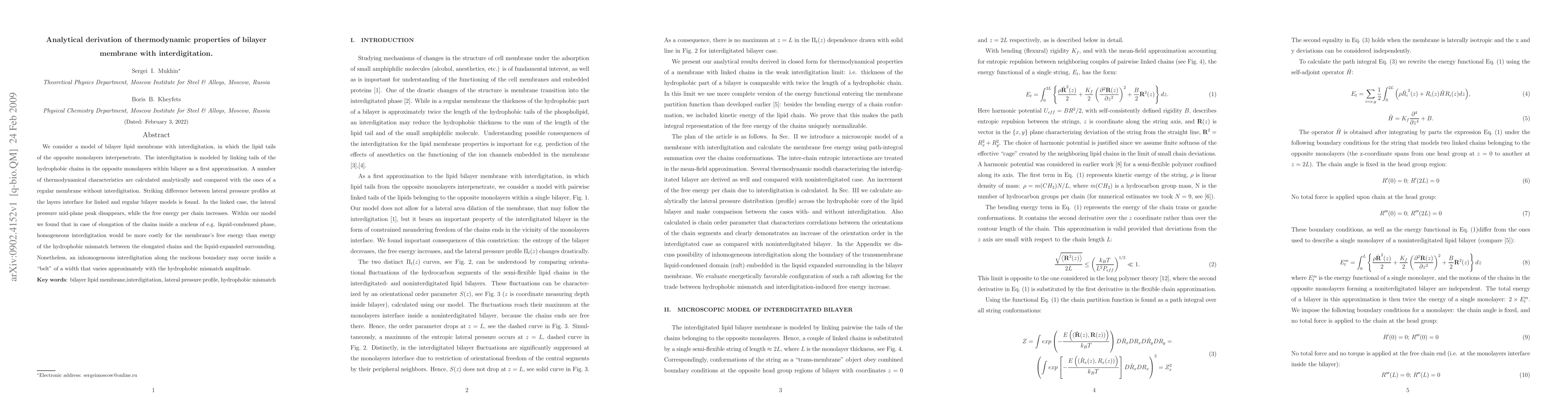 This paper analytically derives thermodynamic properties of a bilayer lipid membrane with interdigitation, where lipid tails interpenetrate between opposite monolayers. It finds significant differences in lateral pressure profiles and free energy compared to regular membranes, indicating that homogeneous interdigitation is energetically unfavorable while inhomogeneous interdigitation may occur along the nucleus boundary.