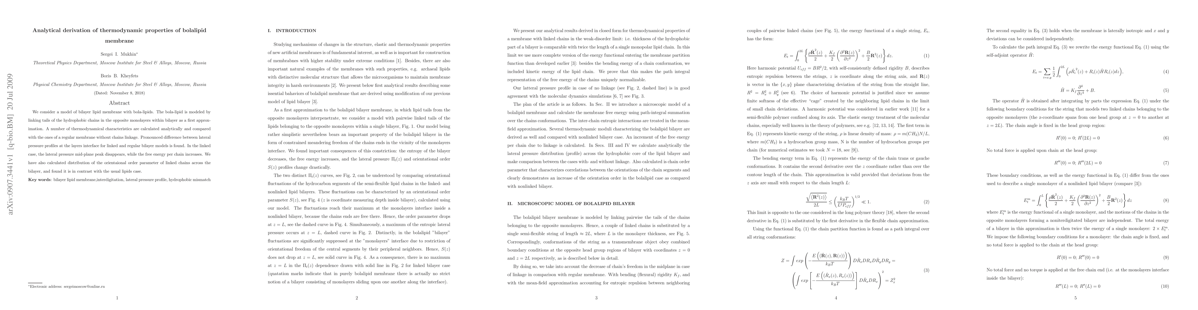 This paper analytically derives thermodynamic properties of a bolalipid bilayer membrane, finding significant differences in lateral pressure profiles and free energy per chain compared to regular membranes. The linked bola-lipid model shows a disappearance of the lateral pressure mid-plane peak and altered orientational order parameter distribution.