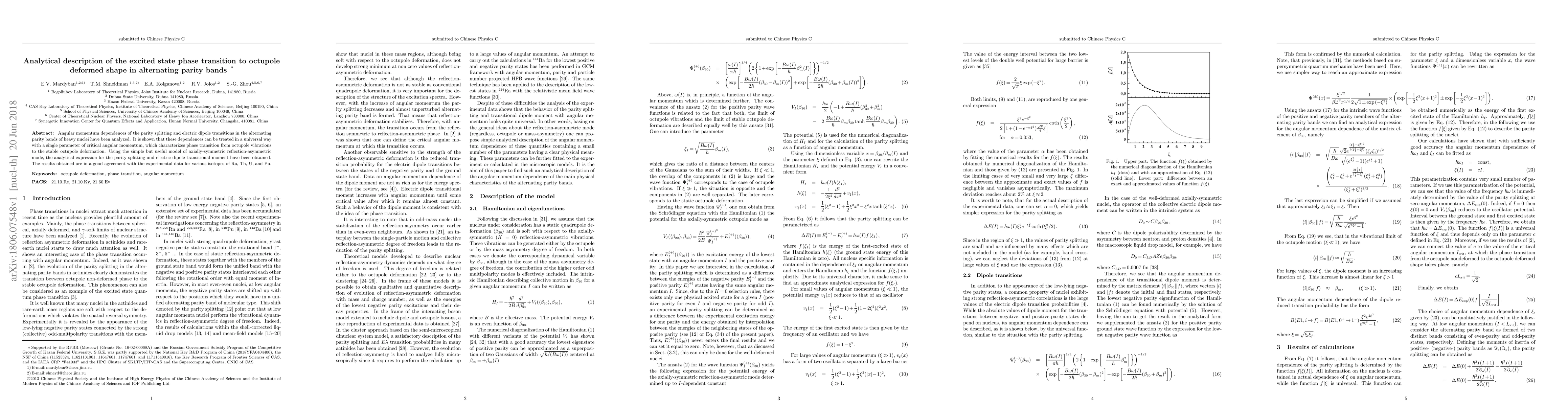 This paper analyzes angular momentum dependencies in alternating parity bands of heavy nuclei, revealing a phase transition to octupole deformation characterized by a critical angular momentum. Analytical expressions for parity splitting and electric dipole transitions are derived using a reflection-asymmetric model, with results matching experimental data from Ra, Th, U, and Pu isotopes.
