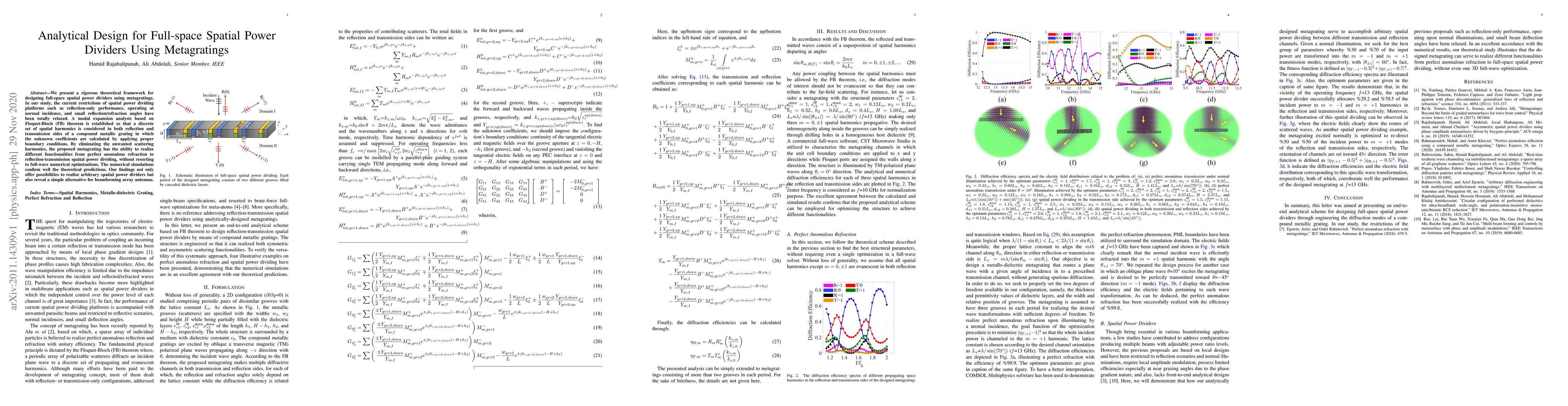 We present a rigorous theoretical framework for designing full-space spatial power dividers using metagratings. In our study, the current restrictions of spatial power dividing platforms such as reflection-only performance, operating at normal incidence, and small reflection/refraction angles have been totally relaxed. A modal expansion analysis based on Floquet-Bloch (FB) theorem is established so that a discrete set of spatial harmonics is considered in both reflection and transmission sides of a compound metallic grating in which the unknown coefficients are calculated by applying proper boundary conditions. By eliminating the unwanted scattering harmonics, the proposed metagrating has the ability to realize different functionalities from perfect anomalous refraction to reflection-transmission spatial power dividing, without resorting to full-wave numerical optimizations. The numerical simulations confirm well the theoretical predictions. Our findings not only offer possibilities to realize arbitrary spatial power dividers but also reveal a simple alternative for beamforming array antennas.