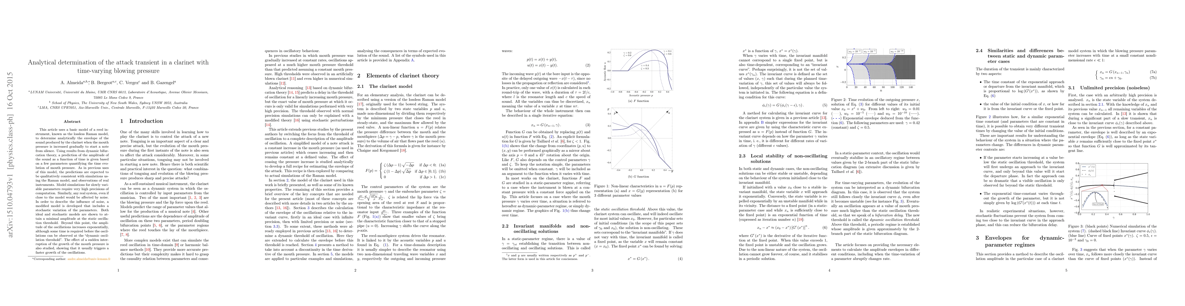 This article uses a basic model of a reed instrument , known as the lossless Raman model, to determine analytically the envelope of the sound produced by the clarinet when the mouth pressure is increased gradually to start a note from silence. Using results from dynamic bifur-cation theory, a prediction of the amplitude of the sound as a function of time is given based on a few parameters quantifying the time evolution of mouth pressure. As in previous uses of this model, the predictions are expected to be qualitatively consistent with simulations using the Raman model, and observations of real instruments. Model simulations for slowly variable parameters require very high precisions of computation. Similarly, any real system, even if close to the model would be affected by noise. In order to describe the influence of noise, a modified model is developed that includes a stochastic variation of the parameters. Both ideal and stochastic models are shown to attain a minimal amplitude at the static oscillation threshold. Beyond this point, the amplitude of the oscillations increases exponentially, although some time is required before the oscillations can be observed at the '' dynamic oscillation threshold ''. The effect of a sudden interruption of the growth of the mouth pressure is also studied, showing that it usually triggers a faster growth of the oscillations.