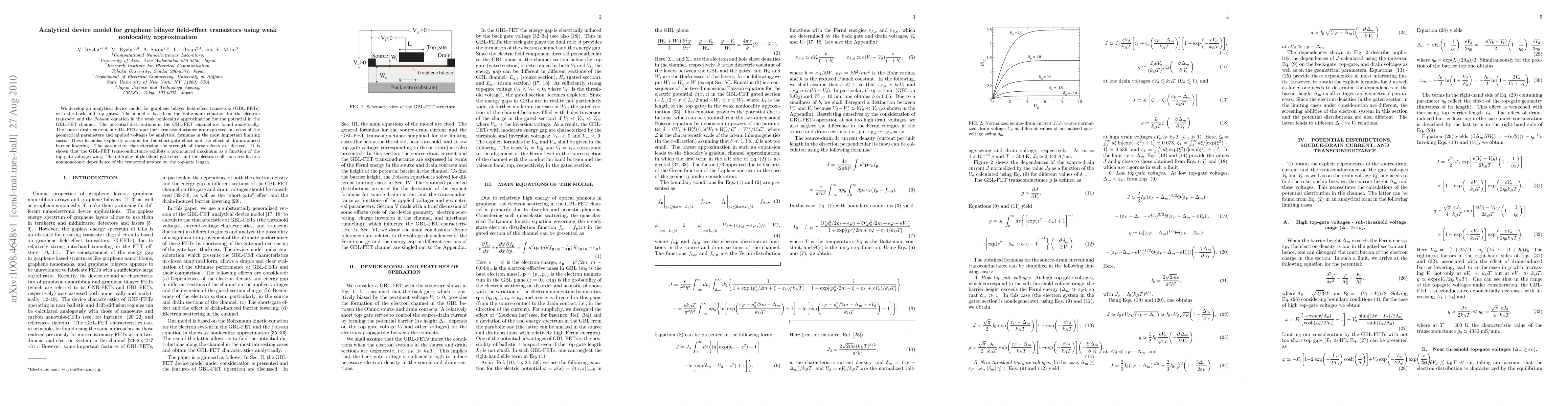 This paper develops an analytical model for graphene bilayer field-effect transistors that accounts for the short-gate effect and drain-induced barrier lowering, showing a pronounced maximum in transconductance with top-gate voltage swing.