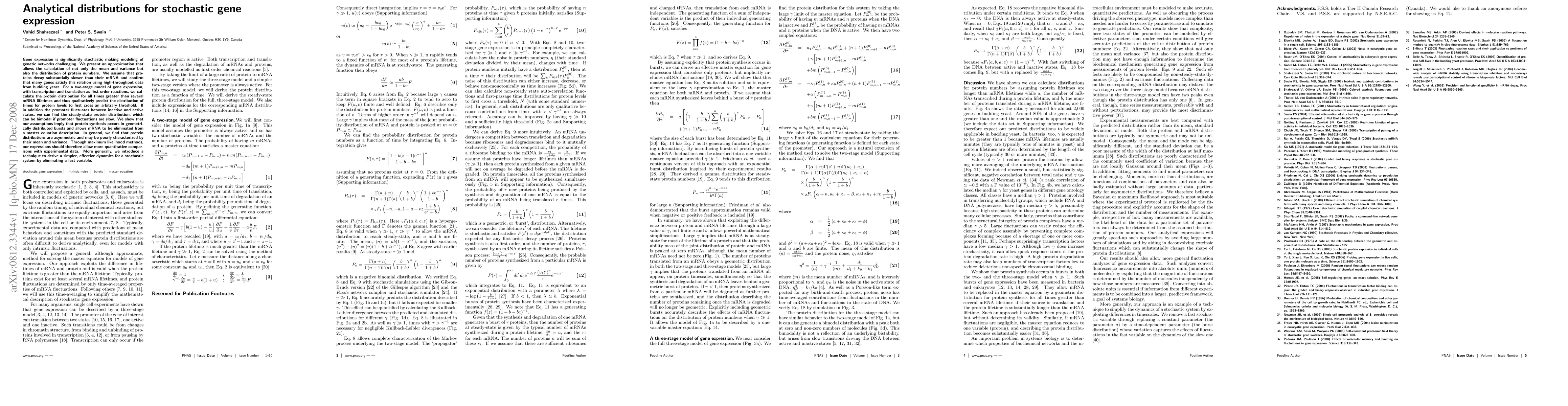 This paper presents an analytical approximation for stochastic gene expression, enabling the calculation of protein distribution, mean, and variance, and applies it to a two-stage model of gene expression. It shows that protein synthesis occurs in geometrically distributed bursts, allowing for more accurate comparisons with experimental data.