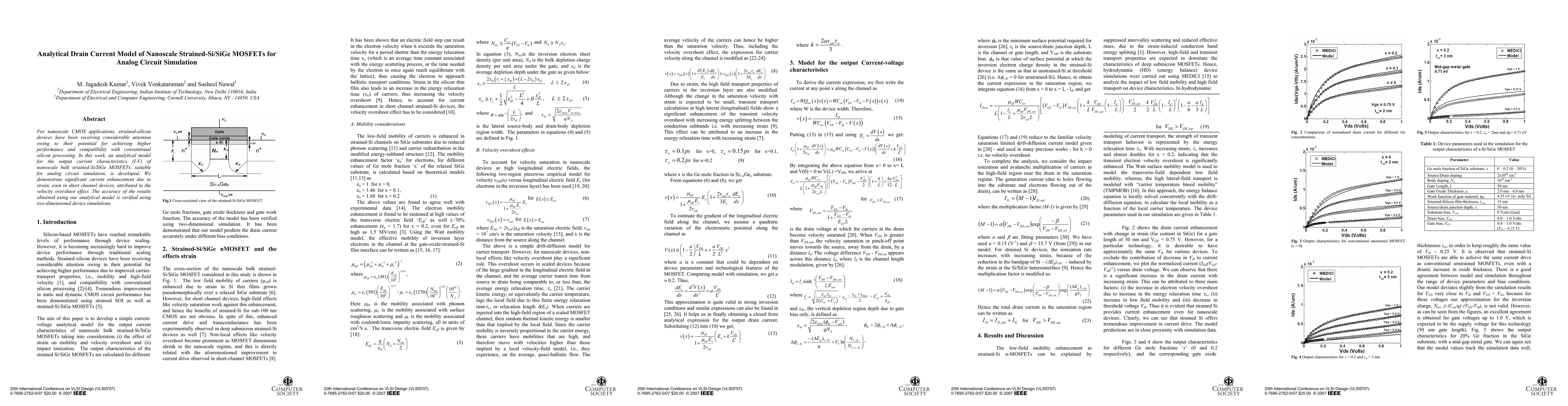 This paper develops an analytical model for the drain current characteristics of nanoscale strained-Si/SiGe MOSFETs, showing significant current enhancement due to strain effects, validated by 2D simulations. The model is designed for accurate analog circuit simulation in advanced CMOS technologies.