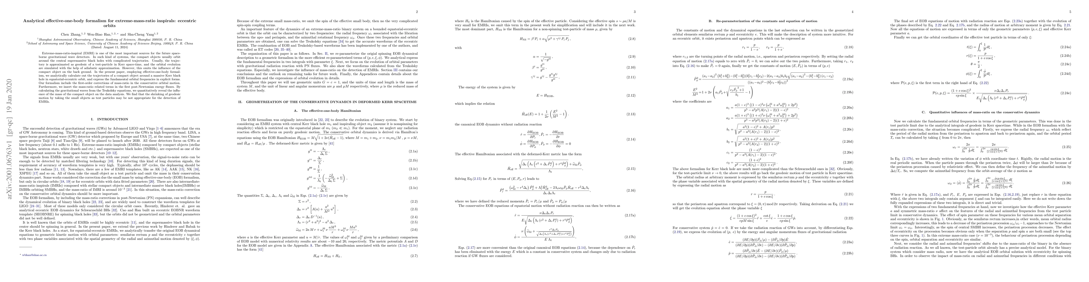 This paper develops an analytical effective-one-body formalism to study the eccentric orbits of compact objects in extreme-mass-ratio inspirals around supermassive black holes. It provides explicit expressions for fundamental orbital frequencies and first-order corrections, revealing the impact of the compact object's mass on gravitational wave signals and suggesting that treating small objects as test particles may not be ideal for EMRI detection.