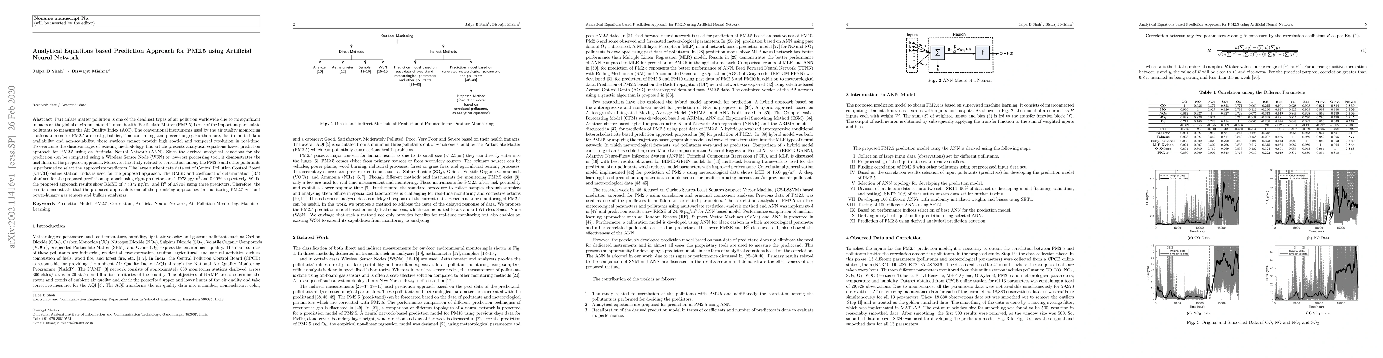 Particulate matter pollution is one of the deadliest types of air pollution worldwide due to its significant impacts on the global environment and human health. Particulate Matter (PM2.5) is one of the important particulate pollutants to measure the Air Quality Index (AQI). The conventional instruments used by the air quality monitoring stations to monitor PM2.5 are costly, bulkier, time-consuming, and power-hungry. Furthermore, due to limited data availability and non-scalability, these stations cannot provide high spatial and temporal resolution in real-time. To overcome the disadvantages of existing methodology this article presents analytical equations based prediction approach for PM2.5 using an Artificial Neural Network (ANN). Since the derived analytical equations for the prediction can be computed using a Wireless Sensor Node (WSN) or low-cost processing tool, it demonstrates the usefulness of the proposed approach. Moreover, the study related to correlation among the PM2.5 and other pollutants is performed to select the appropriate predictors. The large authenticate data set of Central Pollution Control Board (CPCB) online station, India is used for the proposed approach. The RMSE and coefficient of determination (R2) obtained for the proposed prediction approach using eight predictors are 1.7973 ug/m3 and 0.9986 respectively. While the proposed approach results show RMSE of 7.5372 ug/m3 and R2 of 0.9708 using three predictors. Therefore, the results demonstrate that the proposed approach is one of the promising approaches for monitoring PM2.5 without power-hungry gas sensors and bulkier analyzers.