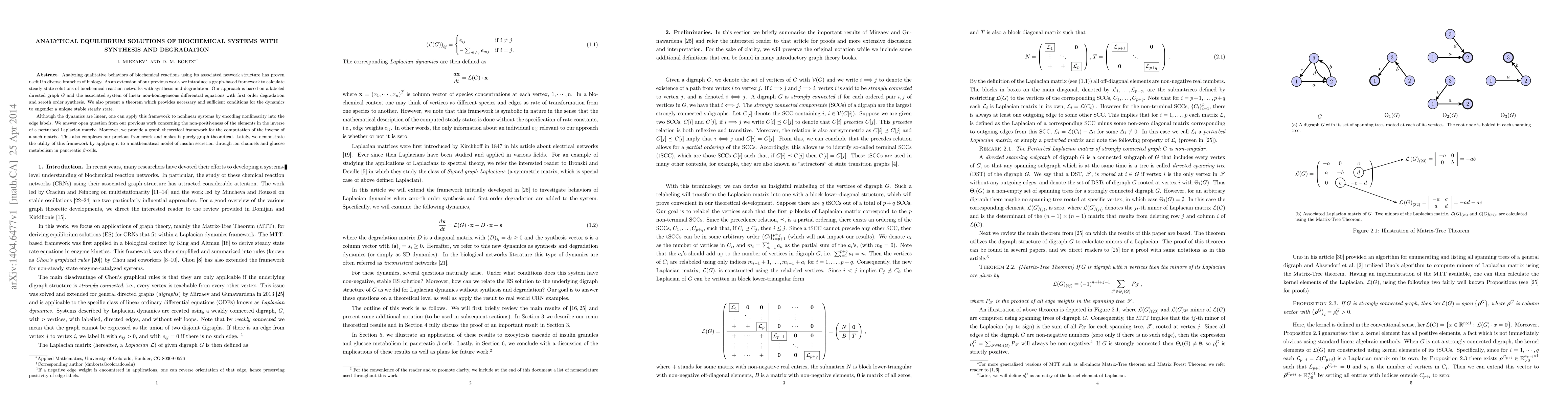 Analyzing qualitative behaviors of biochemical reactions using its associated network structure has proven useful in diverse branches of biology. As an extension of our previous work, we introduce a graph-based framework to calculate steady state solutions of biochemical reaction networks with synthesis and degradation. Our approach is based on a labeled directed graph $G$ and the associated system of linear non-homogeneous differential equations with first order degradation and zeroth order synthesis. We also present a theorem which provides necessary and sufficient conditions for the dynamics to engender a unique stable steady state. Although the dynamics are linear, one can apply this framework to nonlinear systems by encoding nonlinearity into the edge labels. We answer open question from our previous work concerning the non-positiveness of the elements in the inverse of a perturbed Laplacian matrix. Moreover, we provide a graph theoretical framework for the computation of the inverse of a such matrix. This also completes our previous framework and makes it purely graph theoretical. Lately, we demonstrate the utility of this framework by applying it to a mathematical model of insulin secretion through ion channels and glucose metabolism in pancreatic $\beta$-cells.
