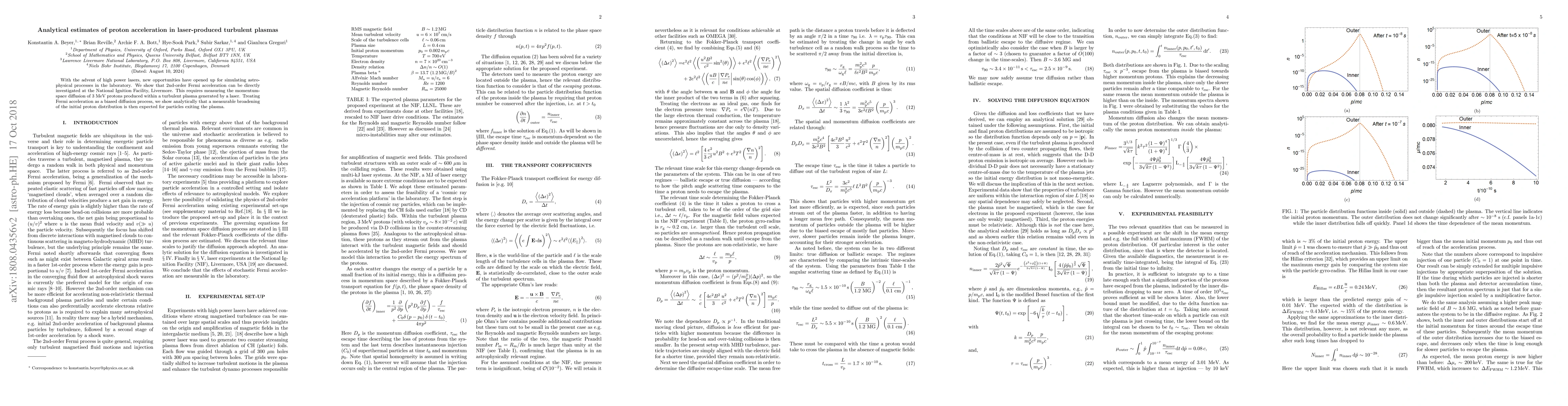 This research investigates the 2nd-order Fermi acceleration mechanism in turbulent plasmas produced by high-power lasers at the National Ignition Facility. Analytical estimates demonstrate that the momentum-space diffusion of 3 MeV protons can be measured, revealing a broadening of the initial proton distribution indicative of this acceleration process.