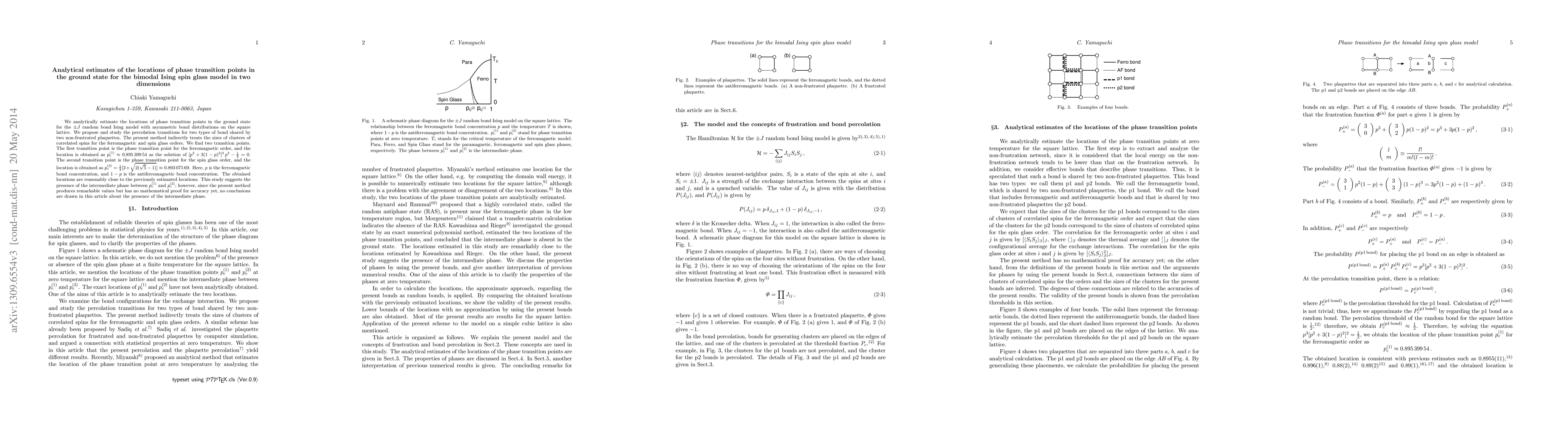 We analytically estimate the locations of phase transition points in the ground state for the $\pm J$ random bond Ising model with asymmetric bond distributions on the square lattice. We propose and study the percolation transitions for two types of bond shared by two non-frustrated plaquettes. The present method indirectly treats the sizes of clusters of correlated spins for the ferromagnetic and spin glass orders. We find two transition points. The first transition point is the phase transition point for the ferromagnetic order, and the location is obtained as $p_c^{(1)} \approx 0.895 \, 399 \, 54$ as the solution of $[p^2 + 3 (1-p)^2 ]^2 \, p^3 - \frac{1}{2} = 0$. The second transition point is the phase transition point for the spin glass order, and the location is obtained as $p_c^{(2)} = \frac{1}{4} [2 + \sqrt{2 (\sqrt{5} - 1)}] \approx 0.893 \, 075 \, 69$. Here, $p$ is the ferromagnetic bond concentration, and $1 - p$ is the antiferromagnetic bond concentration. The obtained locations are reasonably close to the previously estimated locations. This study suggests the presence of the intermediate phase between $p_c^{(1)}$ and $p_c^{(2)}$; however, since the present method produces remarkable values but has no mathematical proof for accuracy yet, no conclusions are drawn in this article about the presence of the intermediate phase.