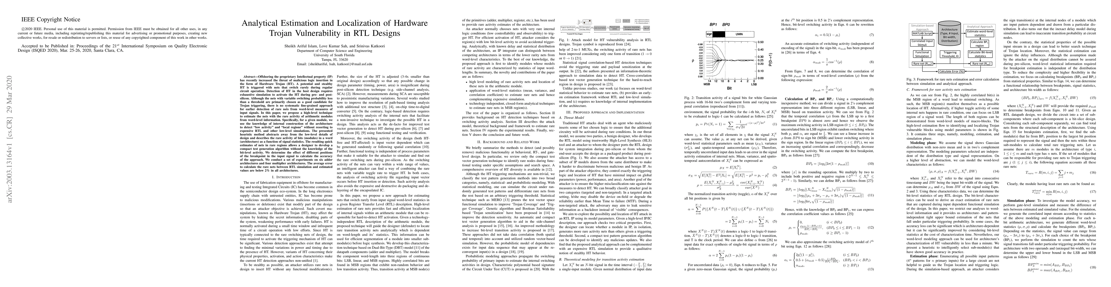 Offshoring the proprietary Intellectual property (IP) has recently increased the threat of malicious logic insertion in the form of Hardware Trojan (HT). A potential and stealthy HT is triggered with nets that switch rarely during regular circuit operation. Detection of HT in the host design requires exhaustive simulation to activate the HT during pre- and postsilicon. Although the nets with variable switching probability less than a threshold are primarily chosen as a good candidate for Trojan triggering, there is no systematic fine-grained approach for earlier detection of rare nets from word-level measures of input signals. In this paper, we propose a high-level technique to estimate the nets with the rare activity of arithmetic modules from word-level information. Specifically, for a given module, we use the knowledge of internal construction of the architecture to detect "low activity" and "local regions" without resorting to expensive RTL and other low-level simulations. The presented heuristic method abstracts away from the low-level details of design and describes the rare activity of bits (modules) in a word (architecture) as a function of signal statistics. The resulting quick estimates of nets in rare regions allows a designer to develop a compact test generation algorithm without the knowledge of the bit-level activity. We determine the effect of different positions of the breakpoint in the input signal to calculate the accuracy of the approach. We conduct a set of experiments on six adder architectures and four multiplier architectures. The average error to calculate the rare nets between RTL simulation and estimated values are below 2% in all architectures.