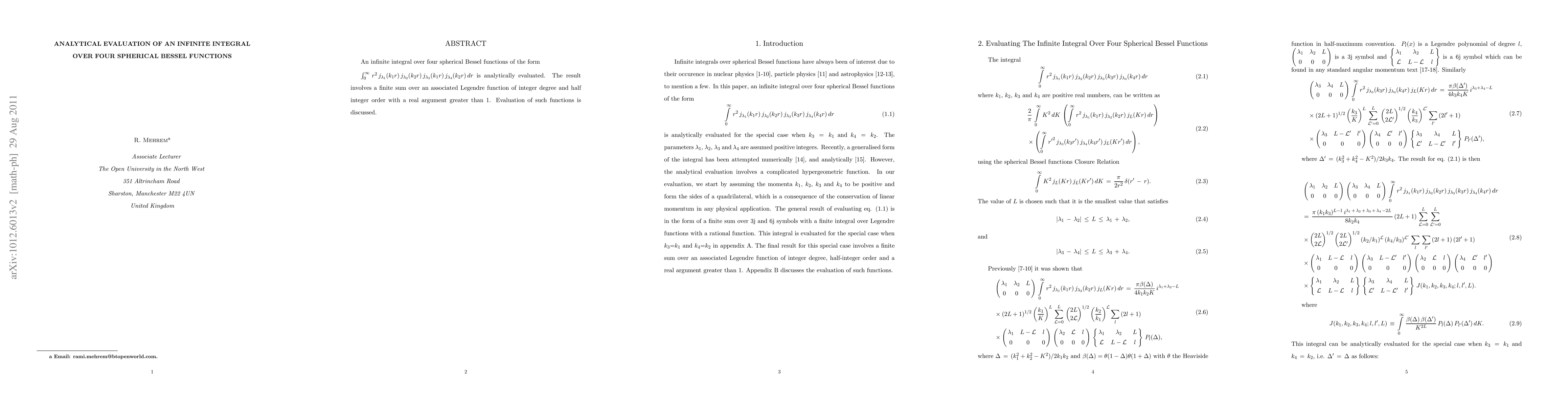 Summary: This paper analytically evaluates an infinite integral involving four spherical Bessel functions under specific conditions where k_3 equals k_1 and k_4 equals k_2, providing a detailed solution for this particular case.