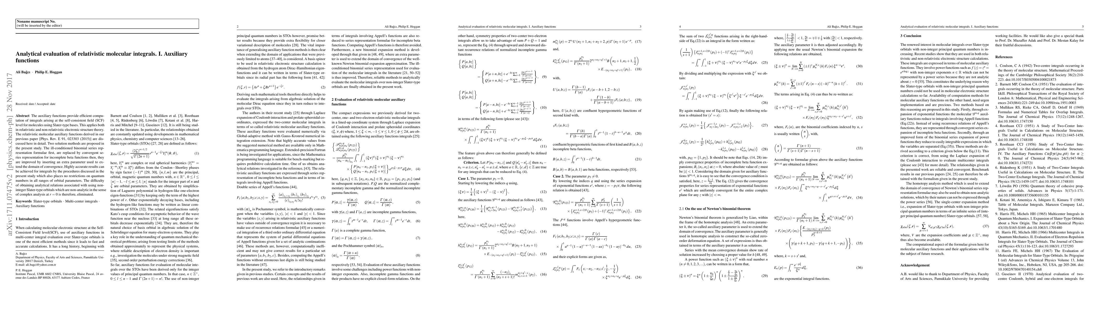 This paper proposes improved methods for computing relativistic molecular integrals using auxiliary functions, replacing ill-conditioned binomial series with convergent series representations for incomplete beta functions, and introducing an extra parameter to extend convergence. The new procedures achieve high accuracy and eliminate difficulties associated with non-integer Slater-type orbitals.