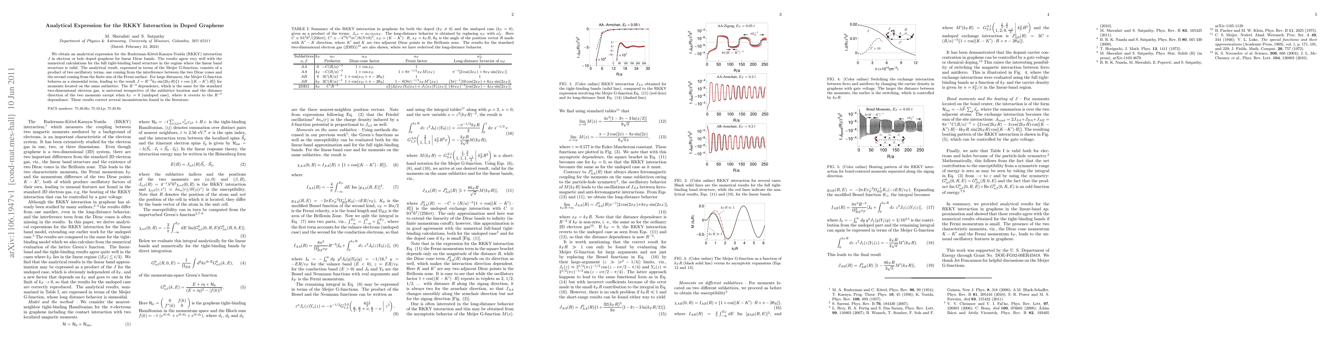 We obtain an analytical expression for the Ruderman-Kittel-Kasuya-Yosida (RKKY) interaction $J$ in electron or hole doped graphene for linear Dirac bands. The results agree very well with the numerical calculations for the full tight-binding band structure in the regime where the linear band structure is valid. The analytical result, expressed in terms of the Meijer G-function, consists of a product of two oscillatory terms, one coming from the interference between the two Dirac cones and the second coming from the finite size of the Fermi surface. For large distances, the Meijer G-function behaves as a sinusoidal term, leading to the result $J \sim R^{-2} k_F \sin (2 k_F R) {1 + \cos[(K-K').R]}$ for moments located on the same sublattice. The $R^{-2}$ dependence, which is the same for the standard two-dimensional electron gas, is universal irrespective of the sublattice location and the distance direction of the two moments except when $k_F =0$ (undoped case), where it reverts to the $R^{-3}$ dependence. These results correct several inconsistencies found in the literature.