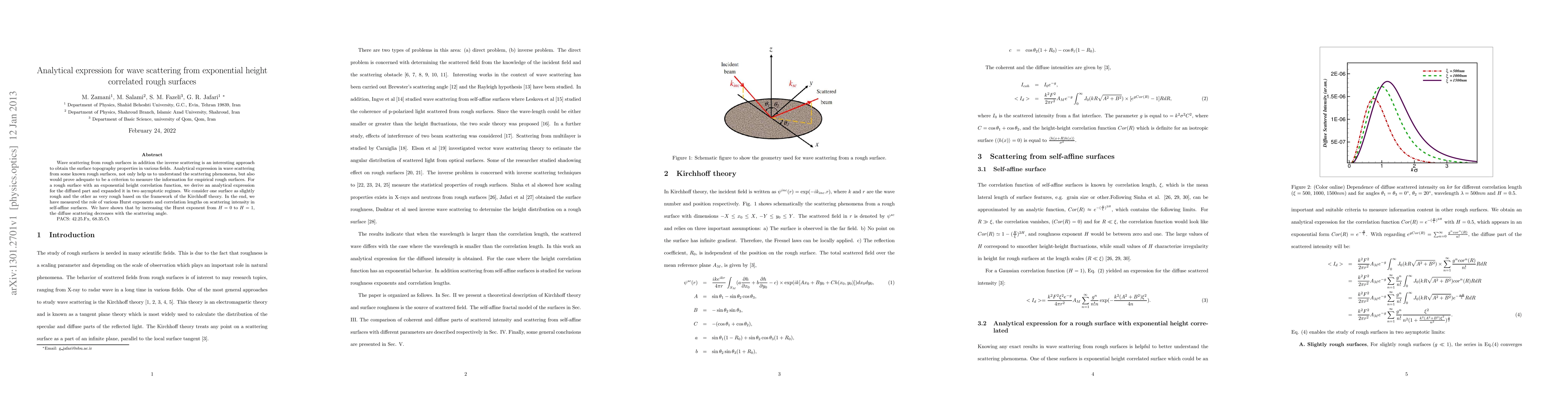This paper derives an analytical expression for wave scattering from rough surfaces with an exponential height correlation function, exploring two asymptotic regimes. It examines the impact of Hurst exponents and correlation lengths on scattering intensity, showing that increased Hurst exponent reduces diffuse scattering with angle.