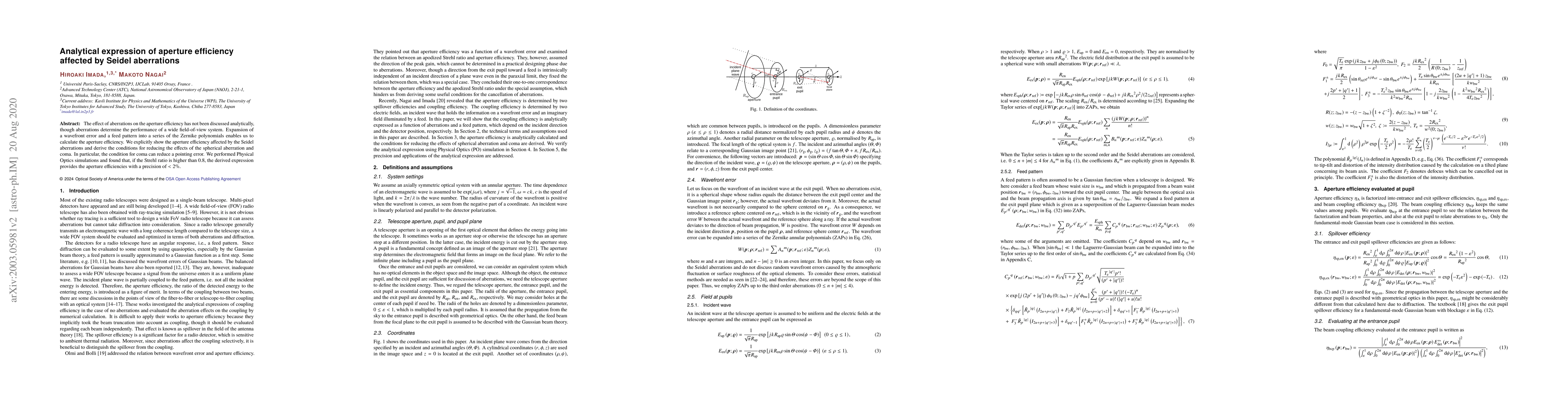 The effect of aberrations on the aperture efficiency has not been discussed analytically, though aberrations determine the performance of a wide field-of-view system. Expansion of a wavefront error and a feed pattern into a series of the Zernike polynomials enables us to calculate the aperture efficiency. We explicitly show the aperture efficiency affected by the Seidel aberrations and derive the conditions for reducing the effects of the spherical aberration and coma. In particular, the condition for coma can reduce a pointing error. We performed Physical Optics simulations and found that, if the Strehl ratio is higher than 0.8, the derived expression provides the aperture efficiencies with a precision of < 2%.