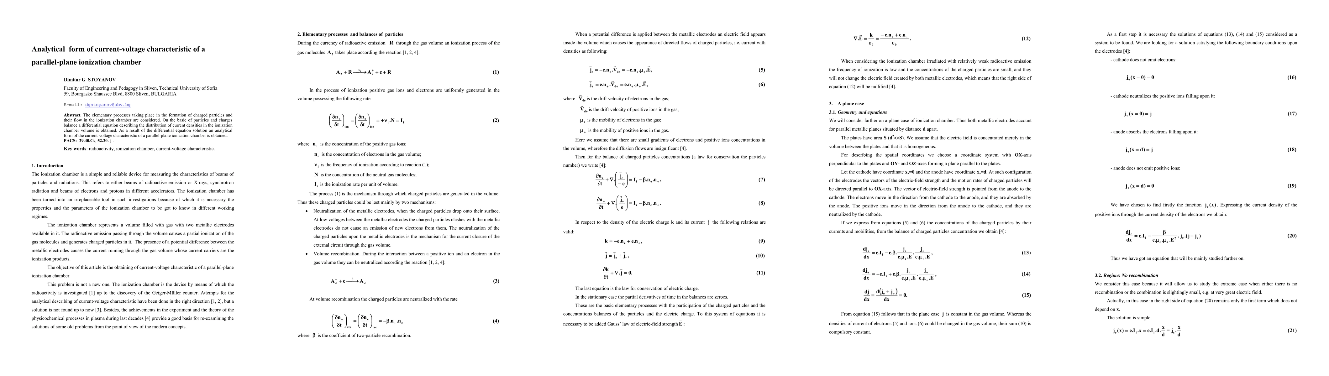 The elementary processes taking place in the formation of charged particles and their flow in the ionization chamber are considered. On the basic of particles and charges balance a differential equation describing the distribution of current densities in the ionization chamber volume is obtained. As a result of the differential equation solution an analytical form of the current-voltage characteristic of a parallel-plane ionization chamber is obtained.