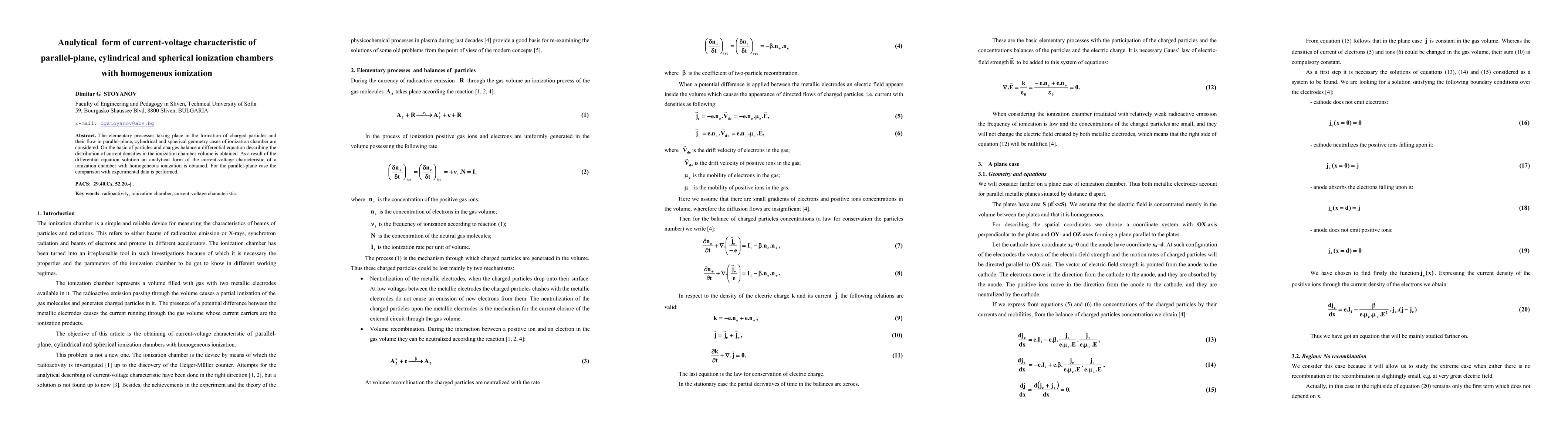 Researchers derived an analytical form of the current-voltage characteristic for parallel-plane, cylindrical, and spherical ionization chambers, offering insights into their behavior and comparing with experimental data for a specific case.