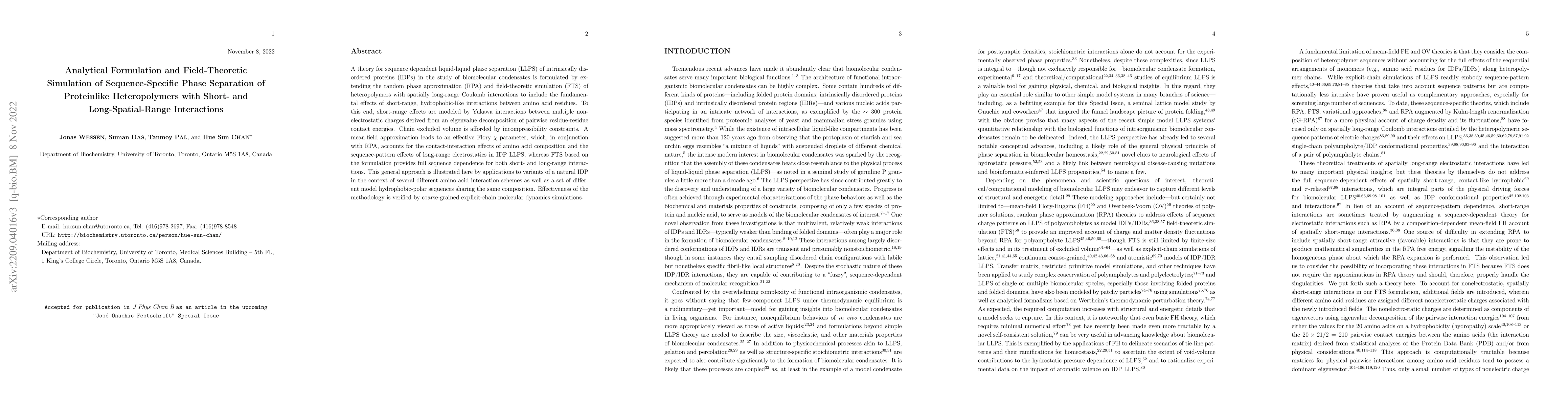 A theory for sequence dependent liquid-liquid phase separation (LLPS) of intrinsically disordered proteins (IDPs) in the study of biomolecular condensates is formulated by extending the random phase approximation (RPA) and field-theoretic simulation (FTS) of heteropolymers with spatially long-range Coulomb interactions to include the fundamental effects of short-range, hydrophobic-like interactions between amino acid residues. To this end, short-range effects are modeled by Yukawa interactions between multiple nonelectrostatic charges derived from an eigenvalue decomposition of pairwise residue-residue contact energies. Chain excluded volume is afforded by incompressibility constraints. A mean-field approximation leads to an effective Flory $\chi$ parameter, which, in conjunction with RPA, accounts for the contact-interaction effects of amino acid composition and the sequence-pattern effects of long-range electrostatics in IDP LLPS, whereas FTS based on the formulation provides full sequence dependence for both short- and long-range interactions. This general approach is illustrated here by applications to variants of a natural IDP in the context of several different amino-acid interaction schemes as well as a set of different model hydrophobic-polar sequences sharing the same composition. Effectiveness of the methodology is verified by coarse-grained explicit-chain molecular dynamics simulations.