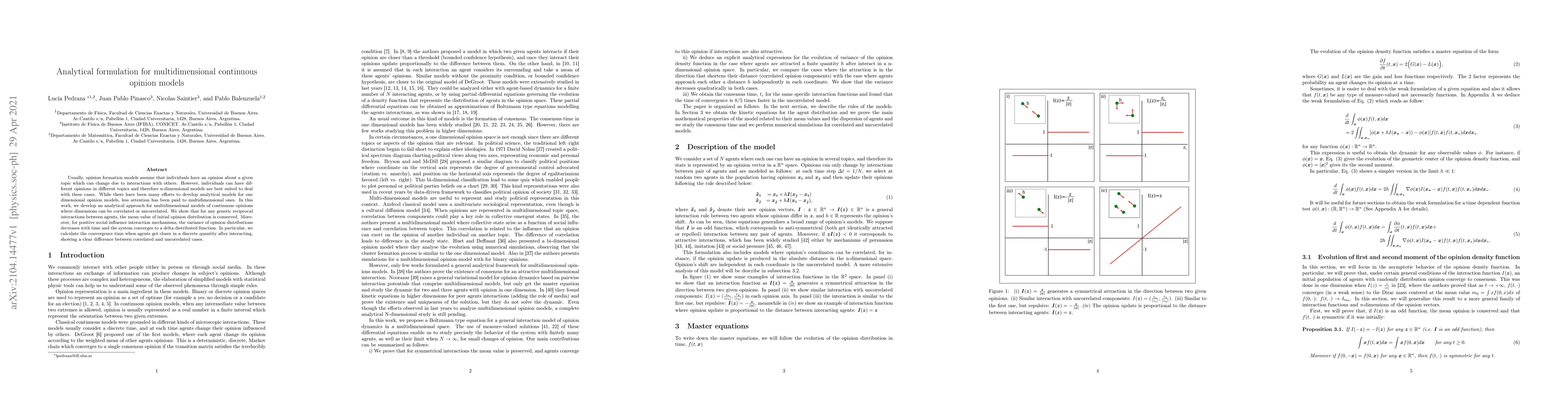 This paper develops an analytical model for multidimensional continuous opinion dynamics, showing that mean opinion distribution is conserved over time. It demonstrates that under positive social influence, opinion variance decreases, leading to convergence to a delta function, with distinct convergence times for correlated versus uncorrelated dimensions.