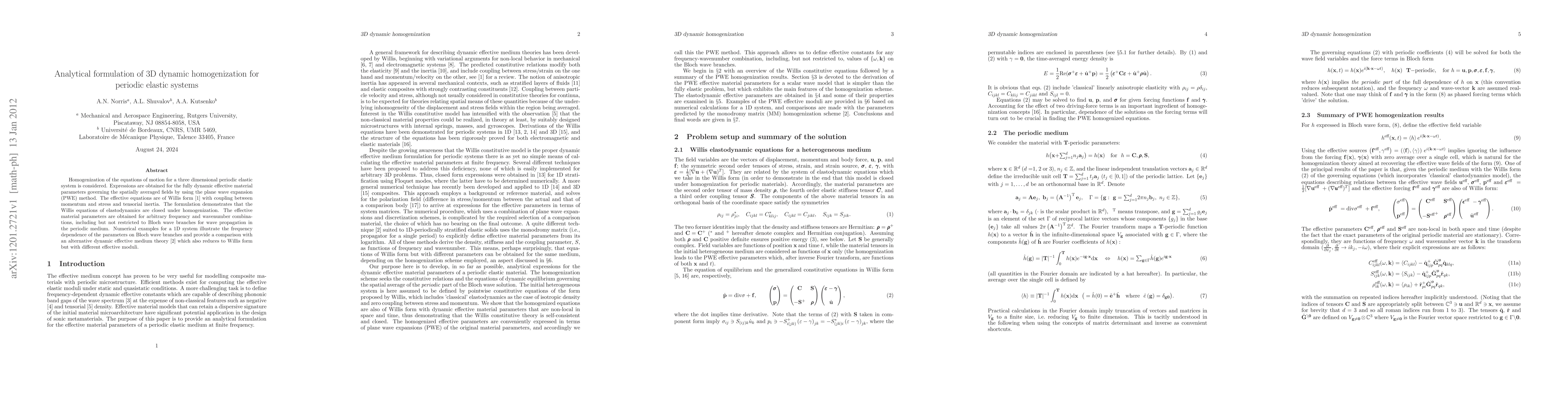 Researchers developed a method to analyze dynamic behavior of 3D periodic elastic systems, finding that their equations can be simplified using homogenization techniques, allowing for accurate predictions of material properties under various frequency and wavenumber conditions.
