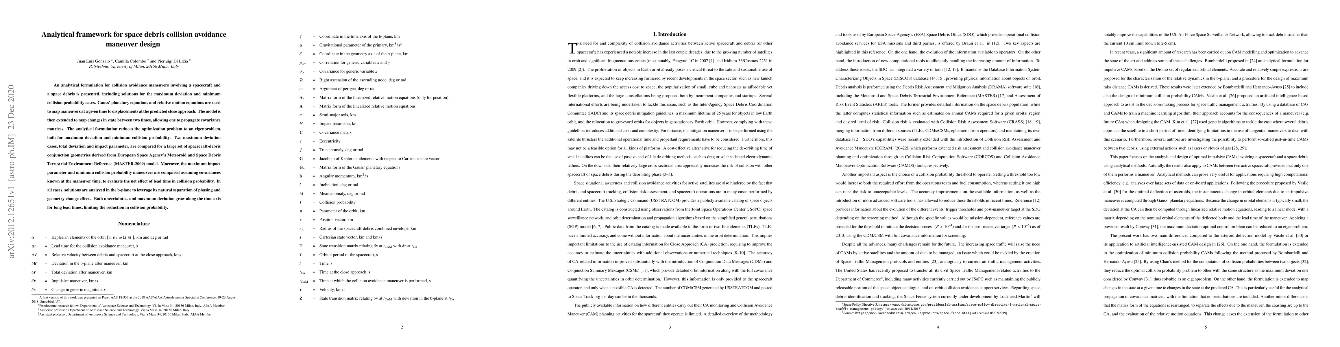 An analytical formulation for collision avoidance maneuvers involving a spacecraft and a space debris is presented, including solutions for the maximum deviation and minimum collision probability cases. Gauss' planetary equations and relative motion equations are used to map maneuvers at a given time to displacements at the predicted close approach. The model is then extended to map changes in state between two times, allowing one to propagate covariance matrices. The analytical formulation reduces the optimization problem to an eigenproblem, both for maximum deviation and minimum collision probability. Two maximum deviation cases, total deviation and impact parameter, are compared for a large set of spacecraft-debris conjunction geometries derived from European Space Agency's Meteoroid and Space Debris Terrestrial Environment Reference (MASTER-2009) model. Moreover, the maximum impact parameter and minimum collision probability maneuvers are compared assuming covariances known at the maneuver time, to evaluate the net effect of lead time in collision probability. In all cases, solutions are analyzed in the b-plane to leverage its natural separation of phasing and geometry change effects. Both uncertainties and maximum deviation grow along the time axis for long lead times, limiting the reduction in collision probability.
