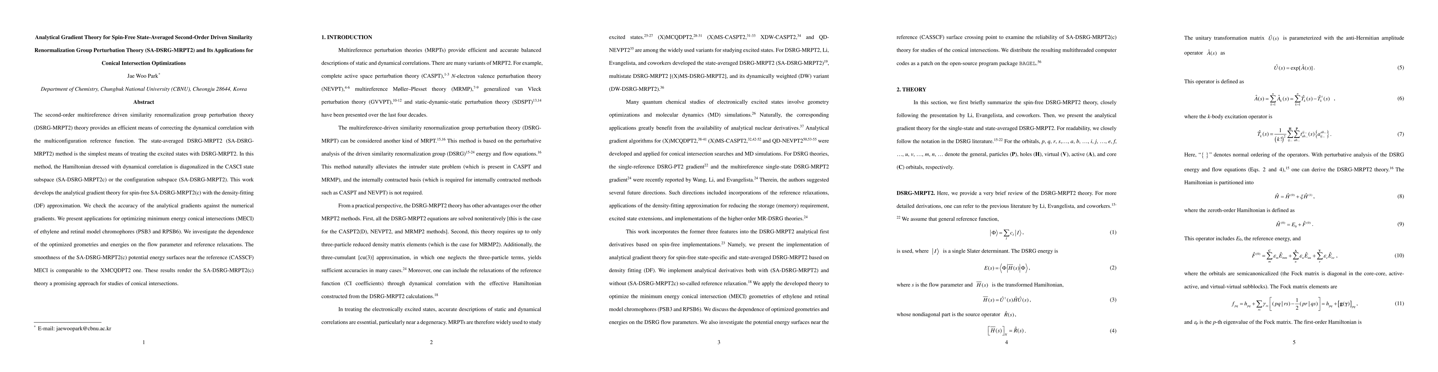 This paper develops an analytical gradient theory for spin-free state-averaged DSRG-MRPT2 with density-fitting, and applies it to optimize minimum energy conical intersections in ethylene and retinal chromophores, demonstrating its potential for studying conical intersections.