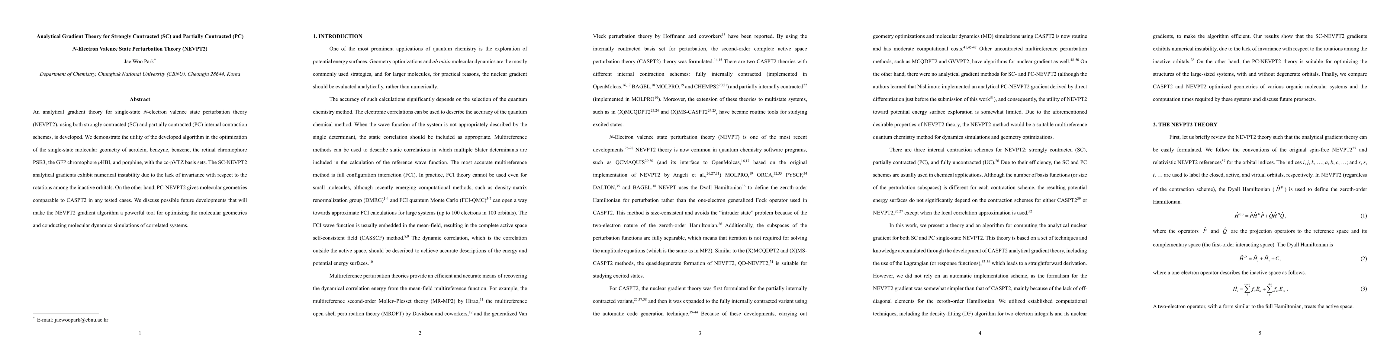 This paper develops an analytical gradient theory for NEVPT2 using SC and PC schemes, demonstrating its utility in optimizing molecular geometries for several molecules. While SC-NEVPT2 gradients show numerical instability, PC-NEVPT2 provides geometries comparable to CASPT2, suggesting future improvements could enhance NEVPT2 for molecular dynamics simulations.