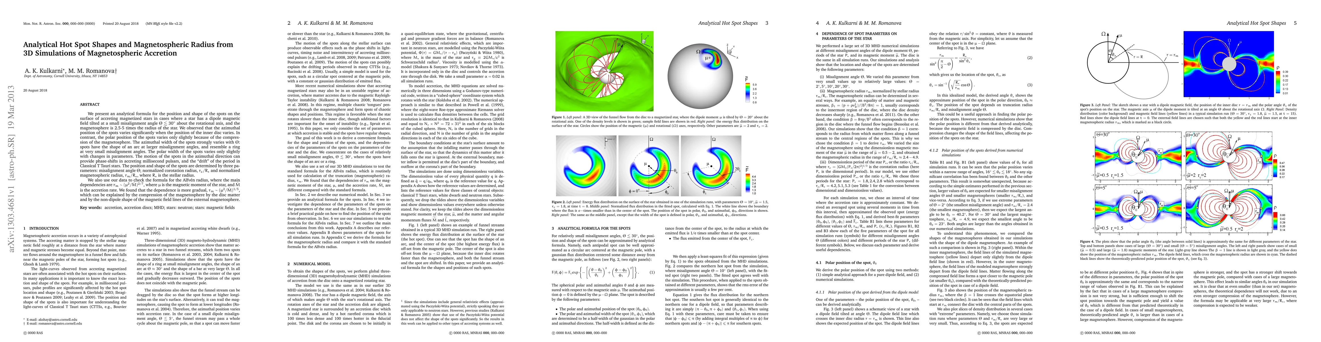 We present an analytical formula for the position and shape of the spots on the surface of accreting magnetized stars in cases where a star has a dipole magnetic field tilted at a small misalignment angle Theta < 30 degrees about the rotational axis, and the magnetosphere is 2.5-5 times the radius of the star. We observed that the azimuthal position of the spots varies significantly when the position of the inner disc varies. In contrast, the polar position of the spots varies only slightly because of the compression of the magnetosphere. The azimuthal width of the spots strongly varies with Theta: spots have the shape of an arc at larger misalignment angles, and resemble a ring at very small misalignment angles. The polar width of the spots varies only slightly with changes in parameters. The motion of the spots in the azimuthal direction can provide phase-shifts in accreting millisecond pulsars, and the "drift" of the period in Classical T Tauri stars. The position and shape of the spots are determined by three parameters: misalignment angle Theta; normalized corotation radius, r_c/R_* and normalized magnetospheric radius, r_m/R_*, where R_* is the stellar radius. We also use our data to check the formula for the Alfv\'en radius, where the main dependencies are r_m \sim (\mu^2/\dot M)^{2/7}, where \mu is the magnetic moment of the star, and \dot M is the accretion rate. We found that the dependence is more gradual, r_m \sim (\mu^2/\dot M)^{1/5}, which can be explained by the compression of the magnetosphere by the disc matter and by the non-dipole shape of the magnetic field lines of the external magnetosphere.
