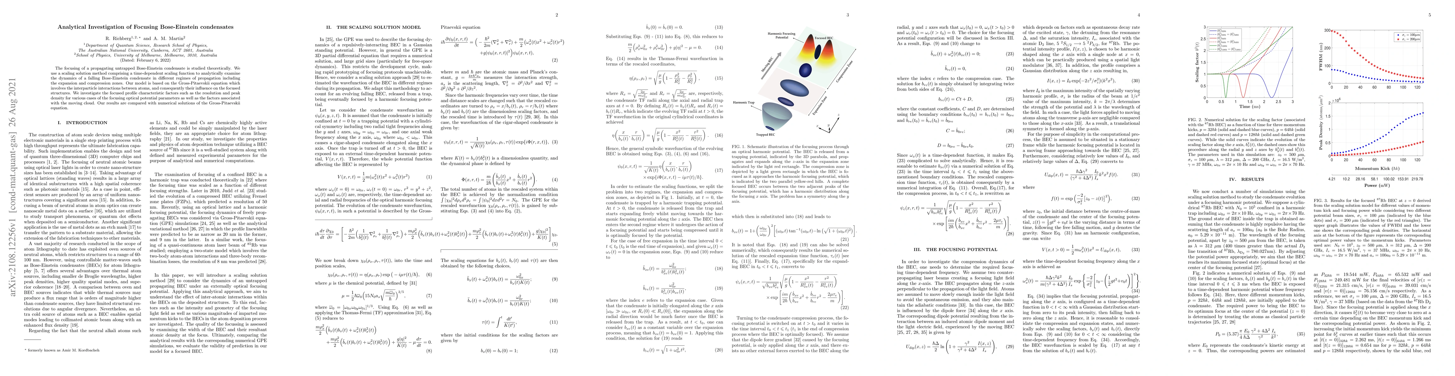 The focusing of a propagating untrapped Bose-Einstein condensate is studied theoretically. We use a scaling solution method comprising a time-dependent scaling function to analytically examine the dynamics of a falling Bose-Einstein condensate in different regimes of propagation including the expansion and compression zones. Our model is based on the Gross-Pitaevskii equation which involves the interparticle interactions between atoms, and consequently their influence on the focused structures. We investigate the focused profile characteristic factors such as the resolution and peak density for various cases of the focusing optical potential parameters as well as the factors associated with the moving cloud. Our results are compared with numerical solutions of the Gross-Pitaevskii equation.