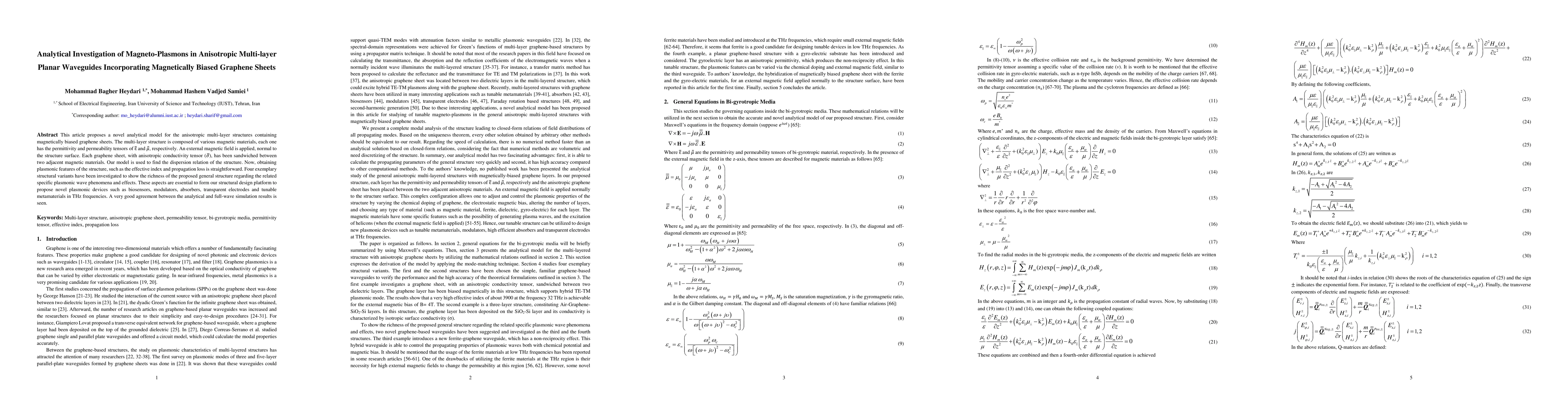 This paper presents an analytical model for anisotropic multi-layer planar waveguides with magnetically biased graphene sheets, revealing the dispersion relation and plasmonic features. The model demonstrates promising applications for novel THz frequency devices, validated by agreement with full-wave simulations.