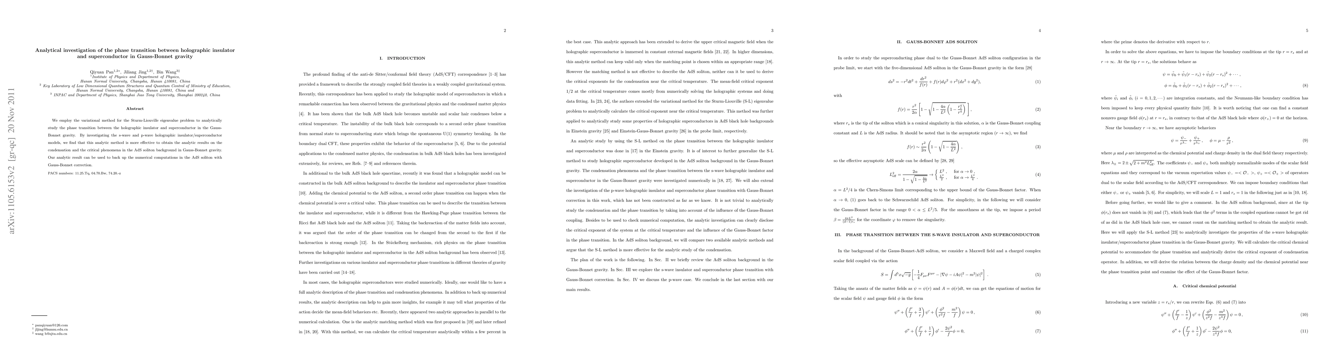 We employ the variational method for the Sturm-Liouville eigenvalue problem to analytically study the phase transition between the holographic insulator and superconductor in the Gauss-Bonnet gravity. By investigating the s-wave and p-wave holographic insulator/superconductor models, we find that this analytic method is more effective to obtain the analytic results on the condensation and the critical phenomena in the AdS soliton background in Gauss-Bonnet gravity. Our analytic result can be used to back up the numerical computations in the AdS soliton with Gauss-Bonnet correction.