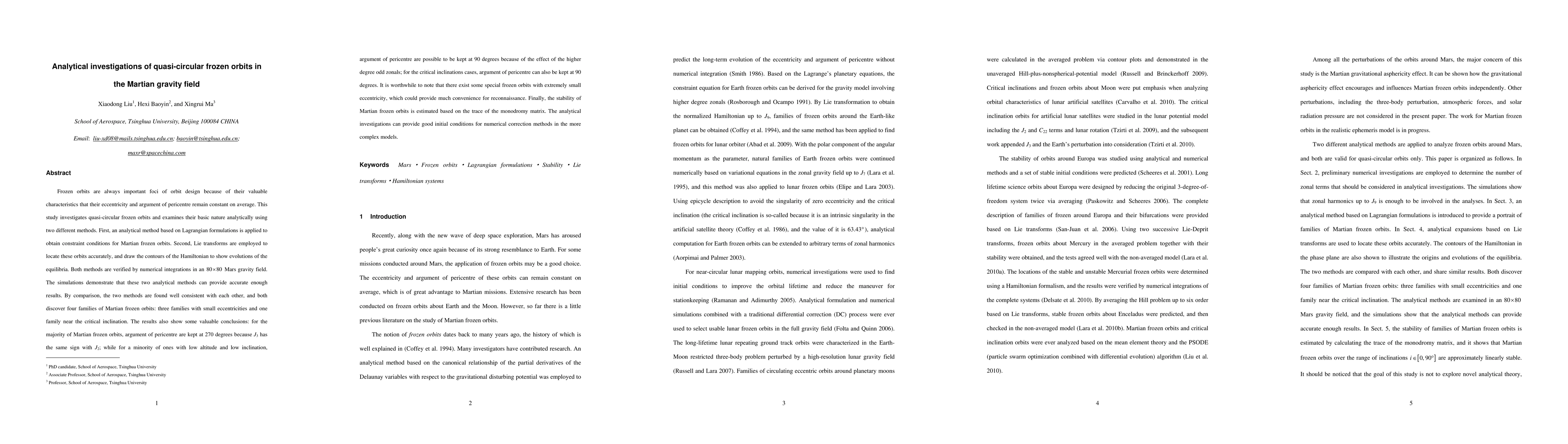 This study analytically investigates quasi-circular frozen orbits in Martian gravity using Lagrangian formulations and Lie transforms, revealing four families of such orbits and their stability. The methods show consistency and provide valuable initial conditions for further numerical corrections.
