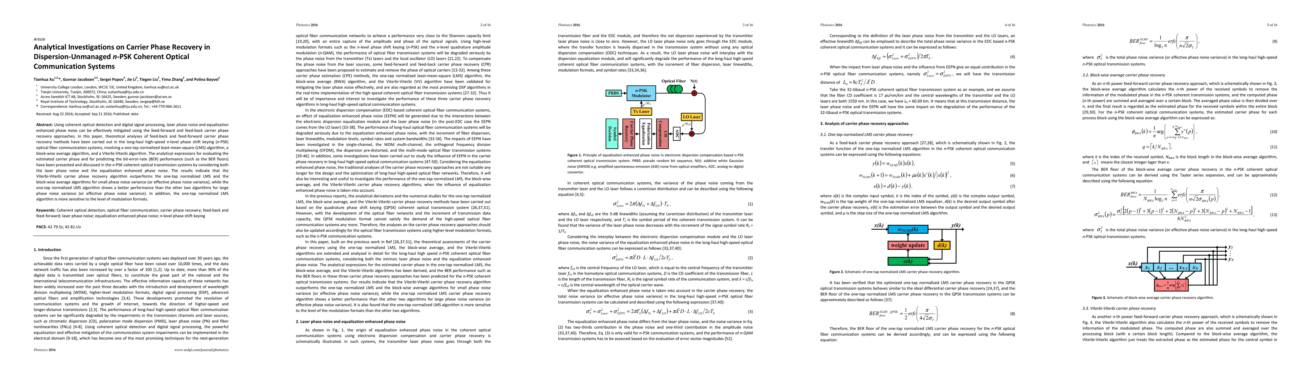 Using coherent optical detection and digital signal processing, laser phase noise and equalization enhanced phase noise can be effectively mitigated using the feed-forward and feed-back carrier phase recovery approaches. In this paper, theoretical analyses of feed-back and feed-forward carrier phase recovery methods have been carried out in the long-haul high-speed n-level phase shift keying (n-PSK) optical fiber communication systems, involving a one-tap normalized least-mean-square (LMS) algorithm, a block-wise average algorithm, and a Viterbi-Viterbi algorithm. The analytical expressions for evaluating the estimated carrier phase and for predicting the bit-error-rate (BER) performance (such as the BER floors) have been presented and discussed in the n-PSK coherent optical transmission systems by considering both the laser phase noise and the equalization enhanced phase noise. The results indicate that the Viterbi-Viterbi carrier phase recovery algorithm outperforms the one-tap normalized LMS and the block-wise average algorithms for small phase noise variance (or effective phase noise variance), while the one-tap normalized LMS algorithm shows a better performance than the other two algorithms for large phase noise variance (or effective phase noise variance). In addition, the one-tap normalized LMS algorithm is more sensitive to the level of modulation formats.