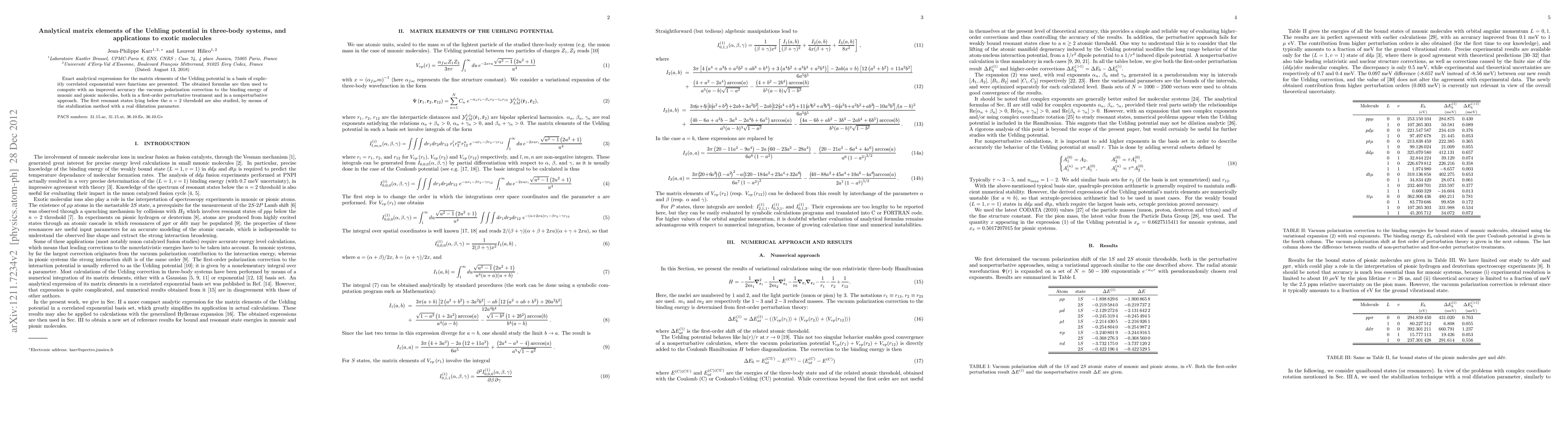 Exact analytical expressions for the matrix elements of the Uehling potential in a basis of explicitly correlated exponential wave functions are presented. The obtained formulas are then used to compute with an improved accuracy the vacuum polarization correction to the binding energy of muonic and pionic molecules, both in a first-order perturbative treatment and in a nonperturbative approach. The first resonant states lying below the n=2 threshold are also studied, by means of the stabilization method with a real dilatation parameter.
